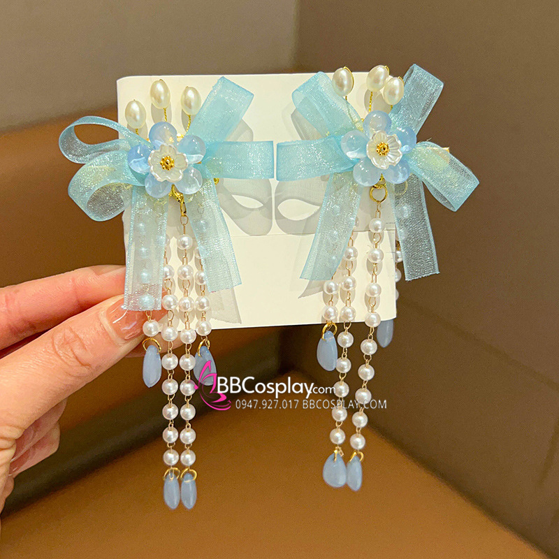 Cặp Kẹp Tóc Ruy Băng Xanh Tone Xanh