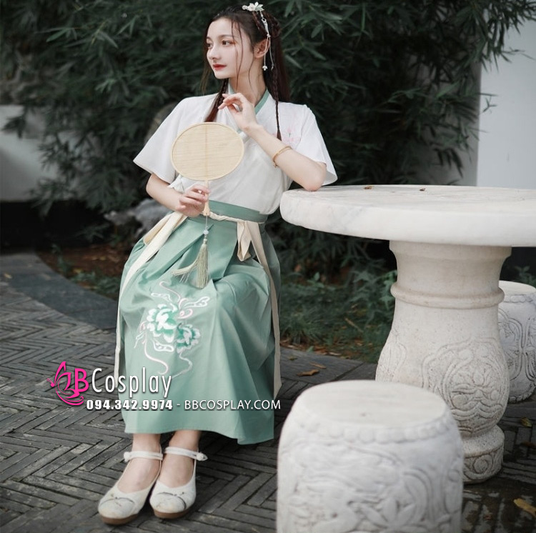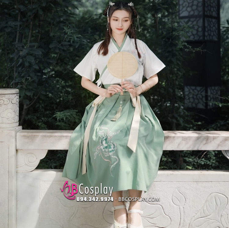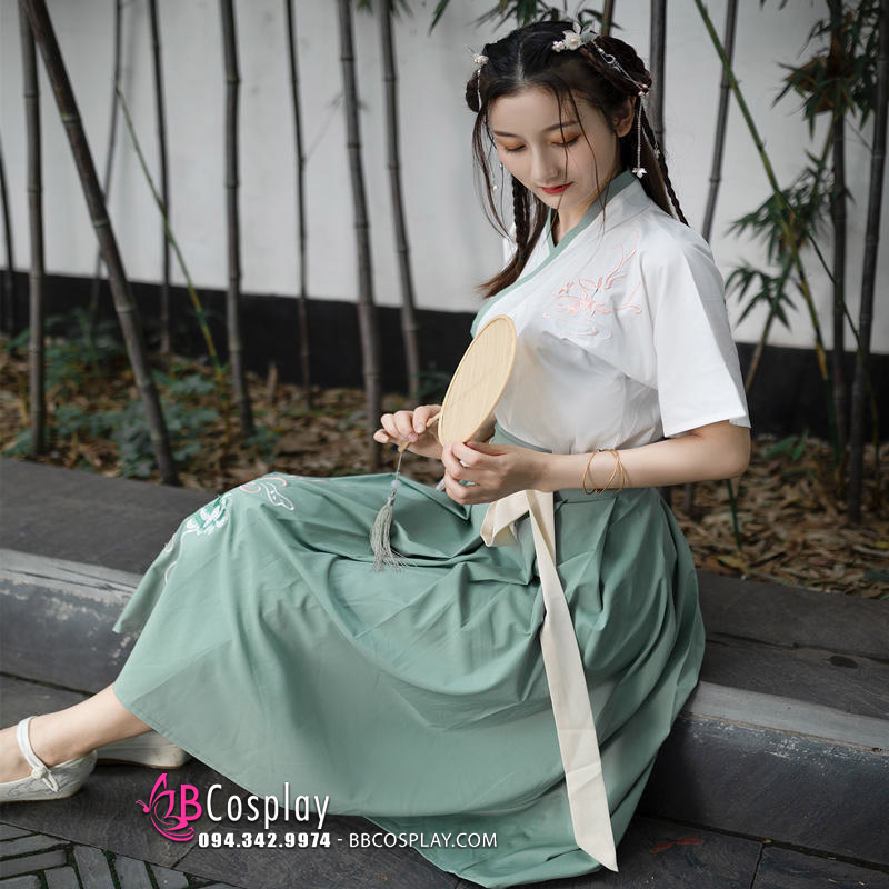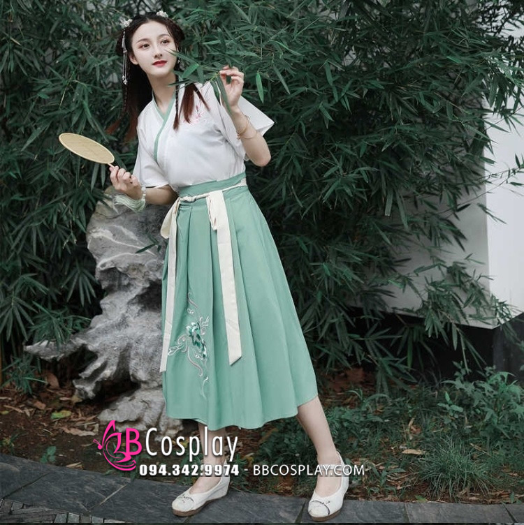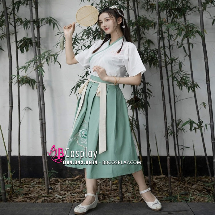 Hán Phục Cách Tân Áo Trắng Viền Xanh Váy Xanh