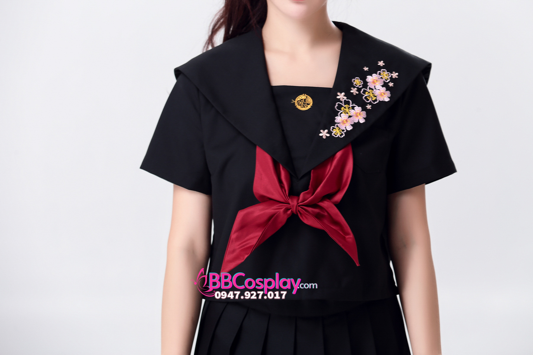 Nữ Sinh Đen Tay Ngắn Thêu Hoa Đào