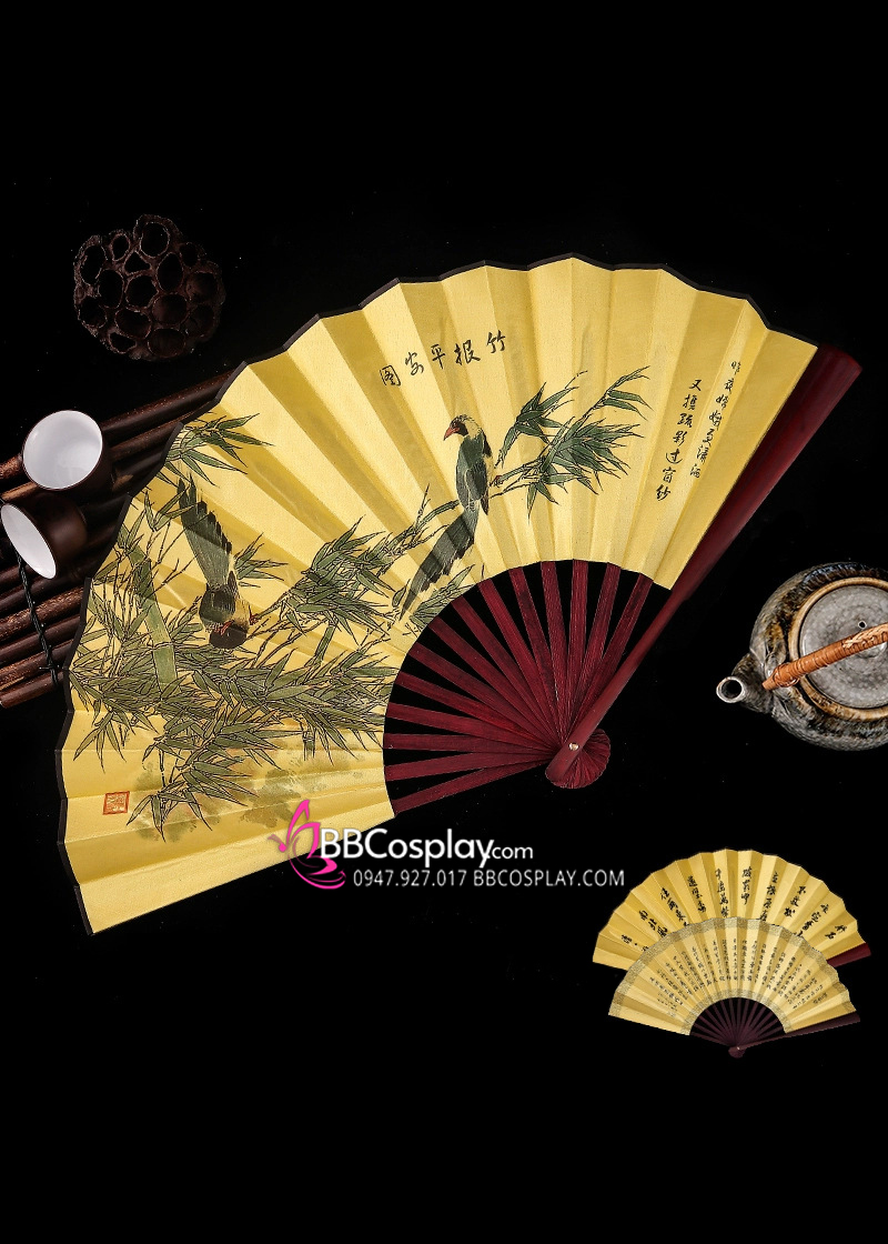 Quạt Xếp Cổ Trang Lớn Cây Tuyết Tùng Và Chim