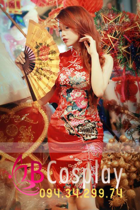 Sườn Xám Đỏ Hoa Ngắn