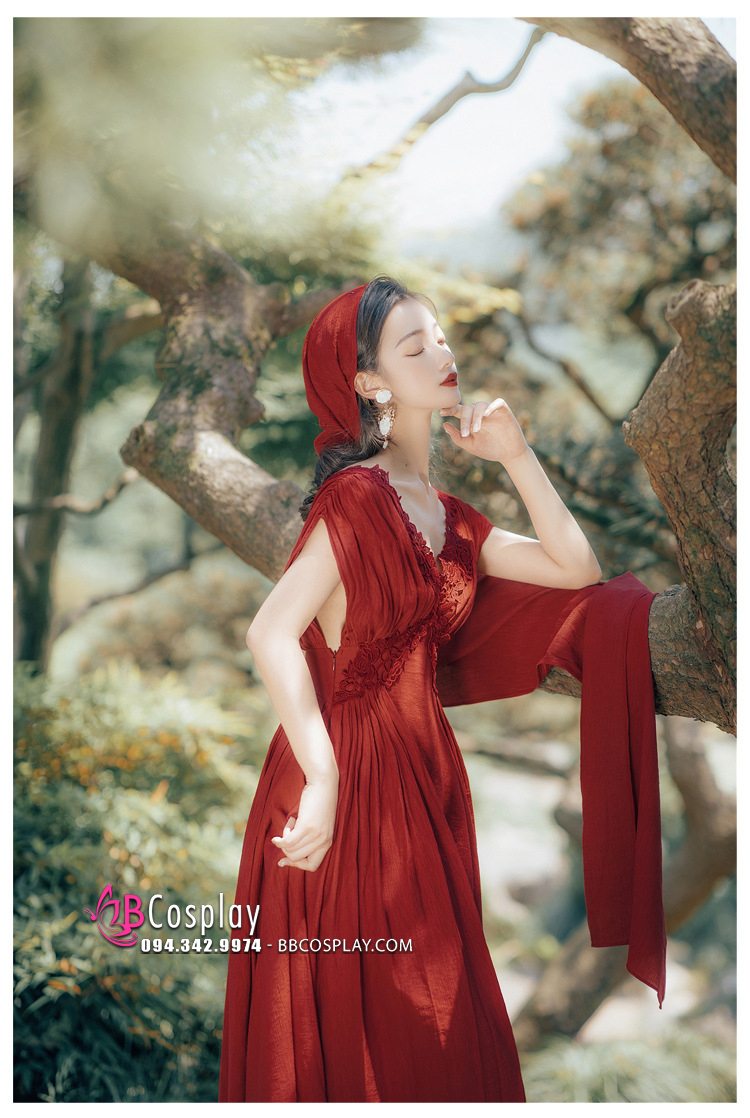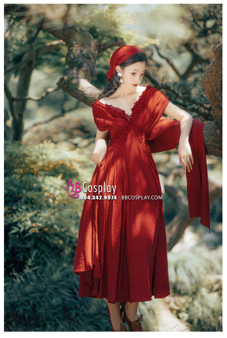 Trang Phục Nàng Hầu Cổ Lá Sen Kèm Tạp Dề Caro - Màu Đỏ