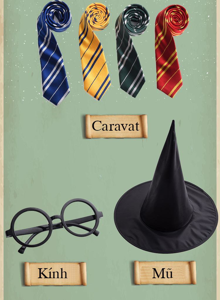trọn bộ 6 món ( áo choàng + khăn cổ + nón + đũa phép + cà vạt + mắt kính)