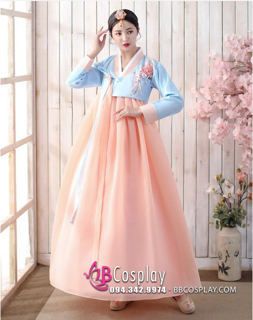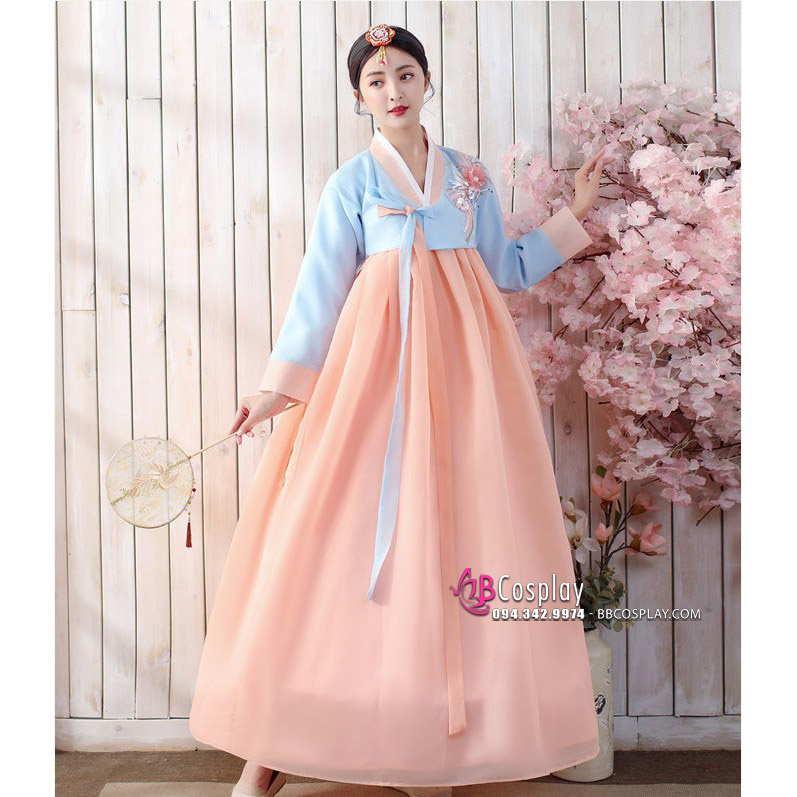 Hanbok Hàn Quốc Áo Xanh Váy Cam Đào