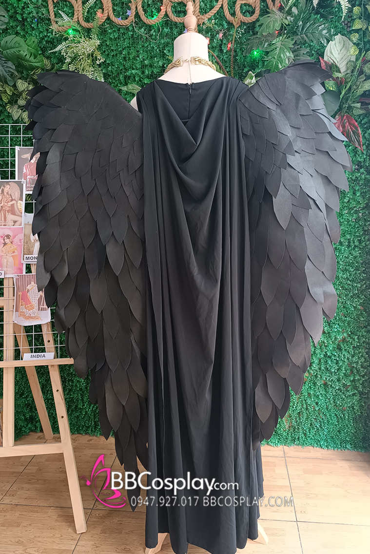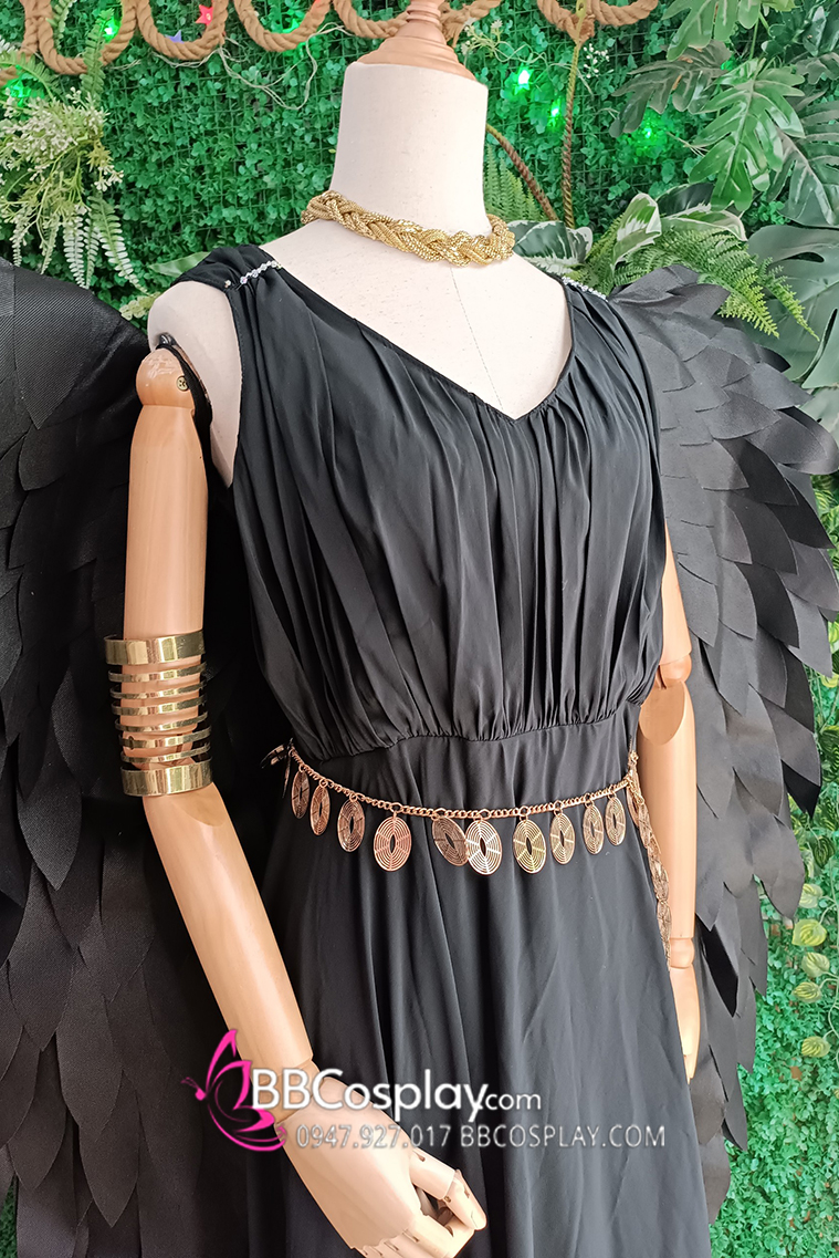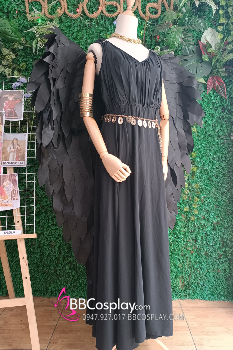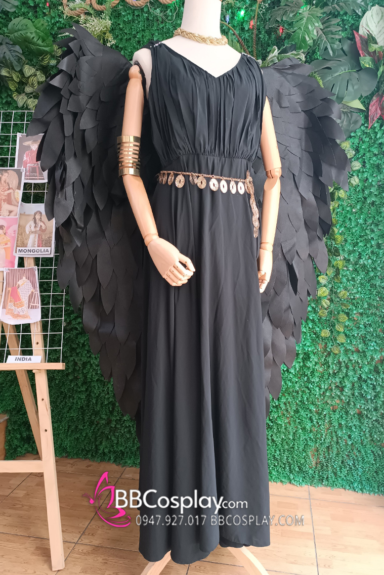 đầm đen dài + cánh đen lớn + băng tay + vòng cổ + thắt lưng