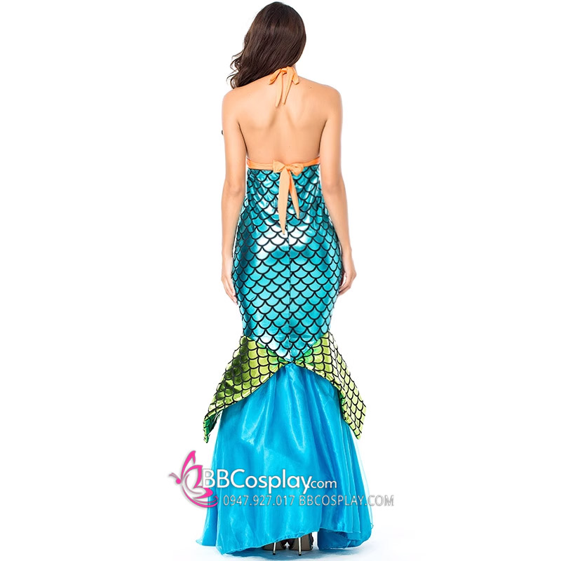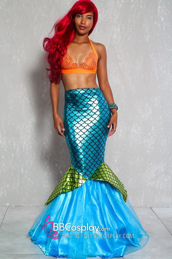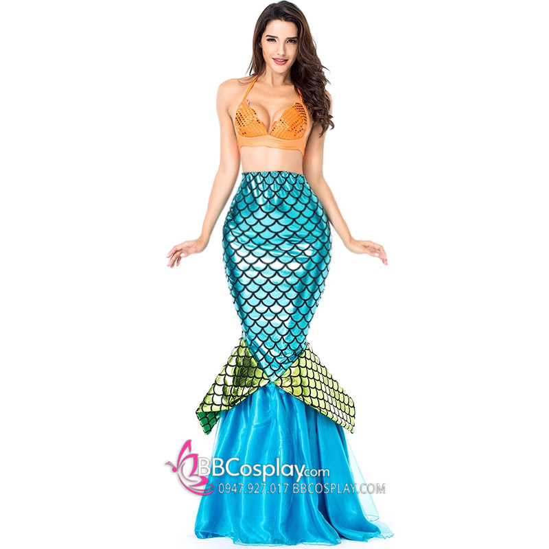 Thành phần: áo bikini cam + váy đuôi cá xanh biển