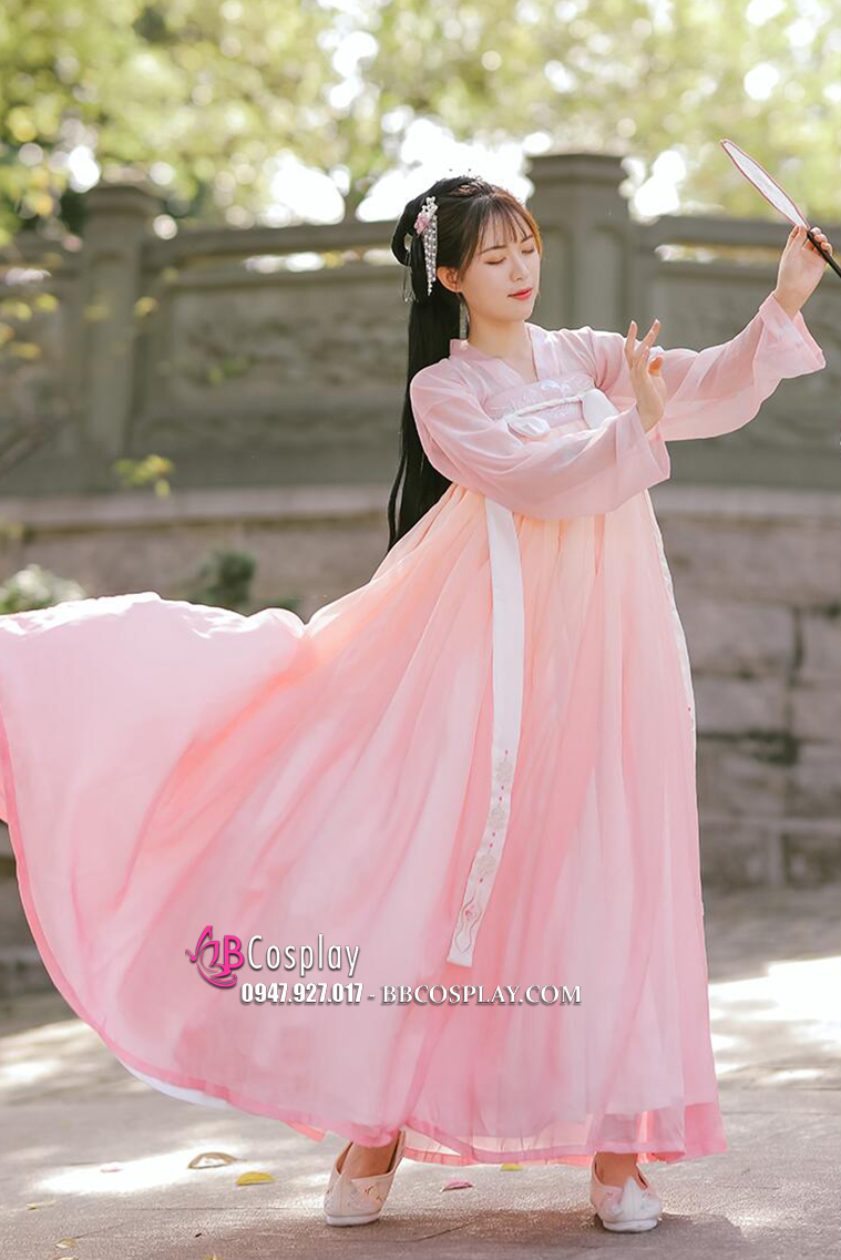 Hán phục Lạc Hoa Bách Hợp Phấn sẽ đem lại sự thoải mái cho người mặc vì chất voan, lụa rất thoáng khí và mềm mại. Trang phục bao gồm áo, váy và dây; có nhiều size, phần dây lưng còn có thể tăng giảm tùy ý theo số đo của người mặc.