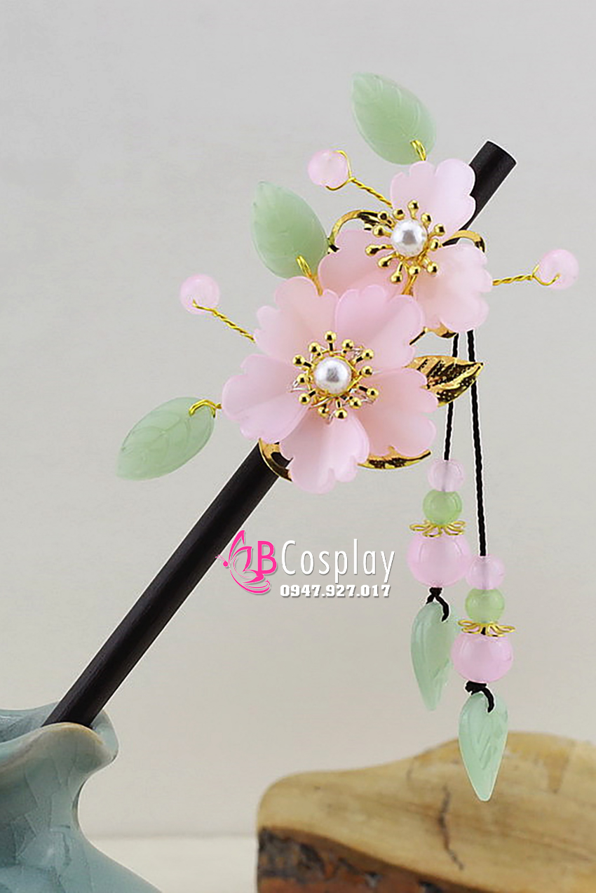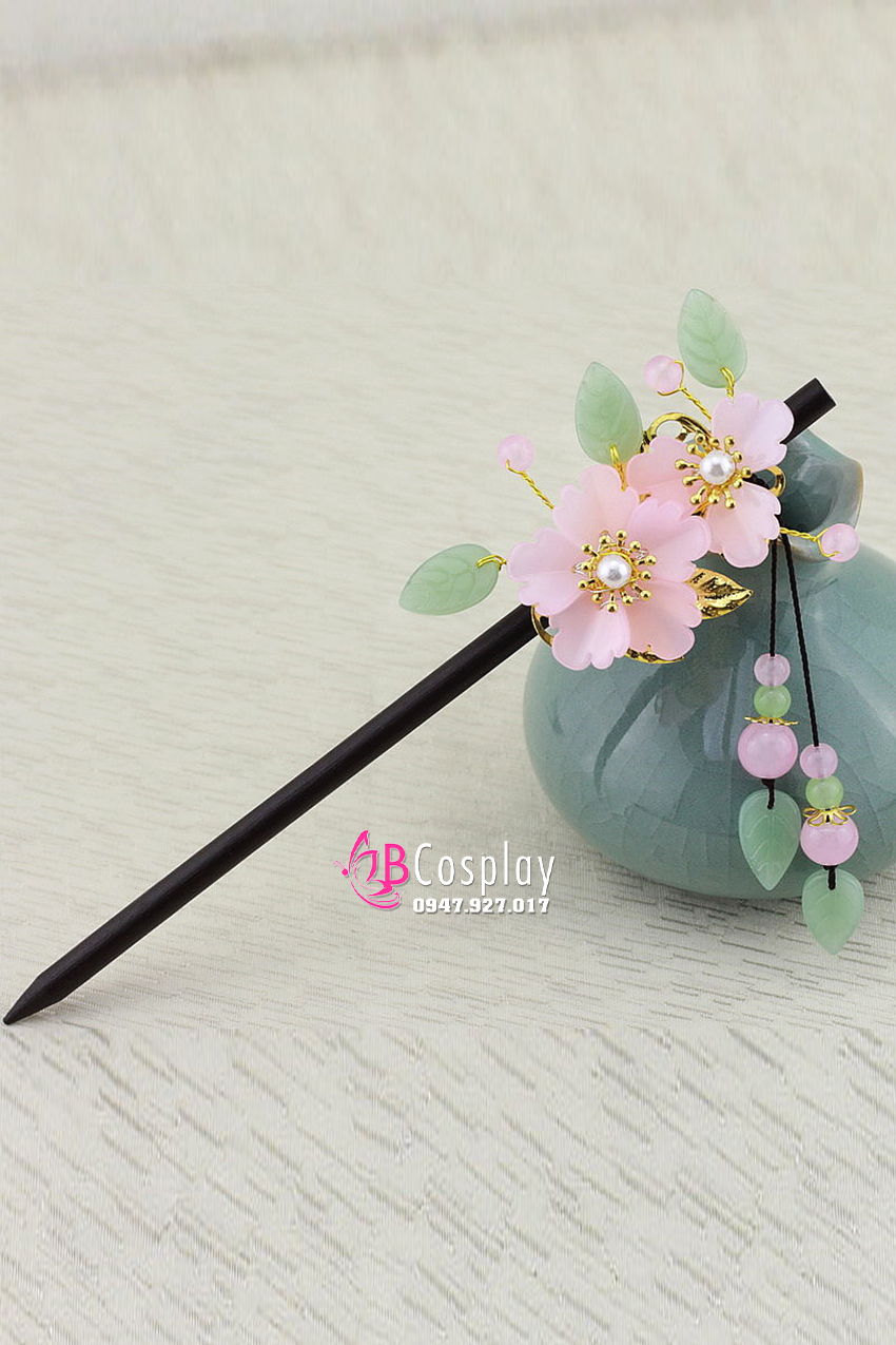 Trâm Cài Hoa Đào Hồng - Tua Rua Ngắn