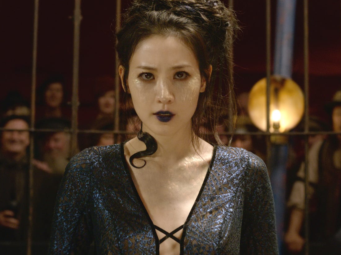 Nagini là một nữ nhân Maledictus , với khả năng biến hình thành rắn . Đến năm 1927 , cô trở thành điểm thu hút đặc trưng trong rạp xiếc phù thủy thuộc sở hữu của Skender (người tuyên bố đã tìm thấy cô trong 'rừng rậm Indonesia). Tại một thời điểm nào đó, cô kết bạn với Obscurial Credence Barebone , người đã đến châu Âu với gánh xiếc sau khi sống sót sau khi MACUSA cố gắng tiêu diệt anh ta ở New York , sau khi anh ta tấn công thành phố vào tháng 12 năm 1926 .