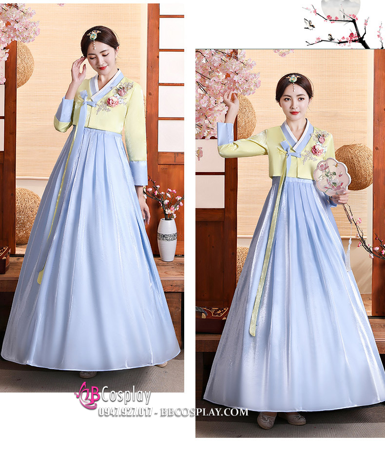 Hanbok Truyền Thống Hàn Quốc Rũ Váy Xanh Áo Vàng Chanh Mẫu Mới