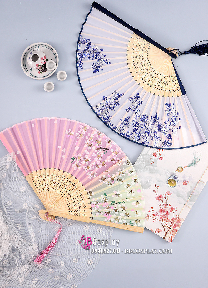 Quạt Xếp Giá Rẻ Cán Gỗ Vải In Hoa Nhiều Mẫu