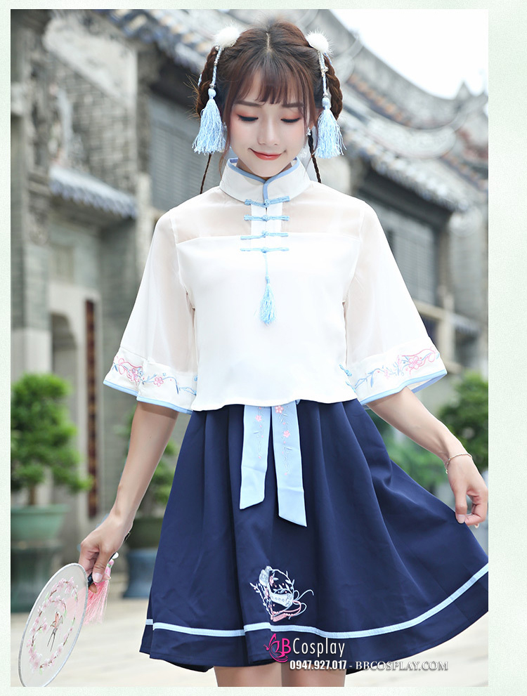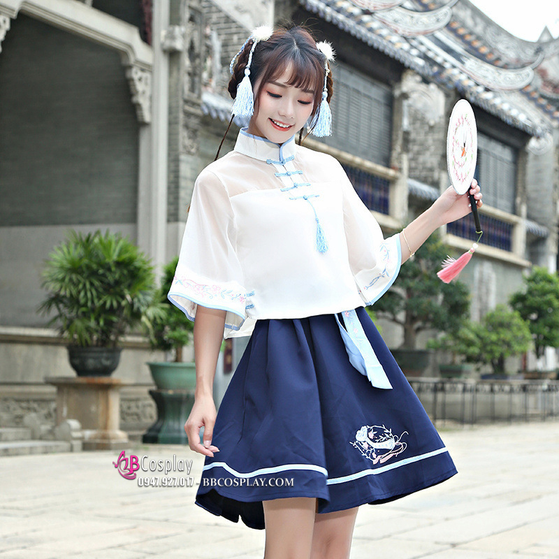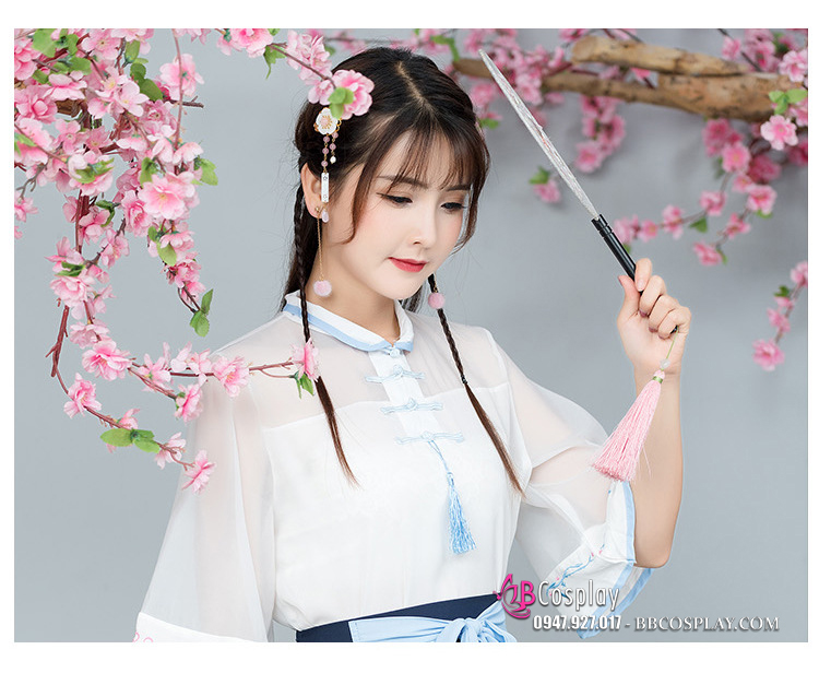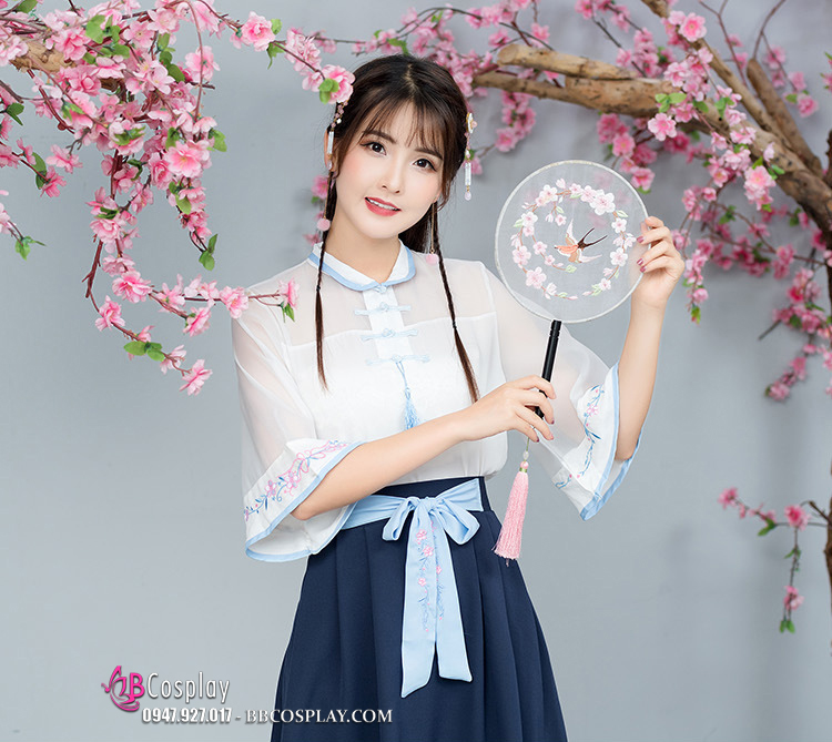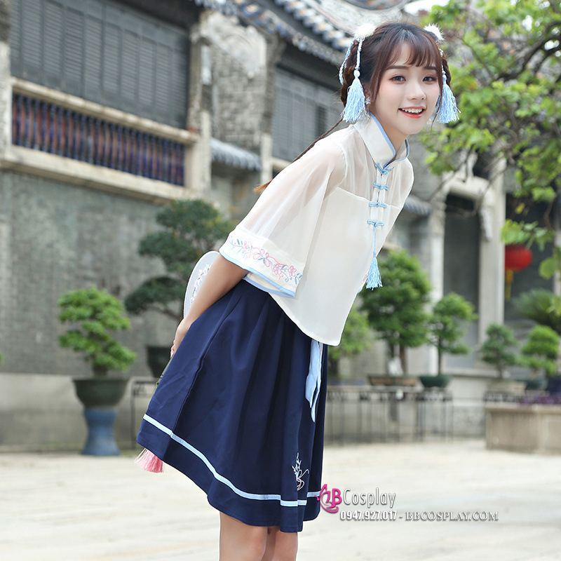 Hán Phục Cách Tân Áo Trắng Váy Xanh Cổ Tàu