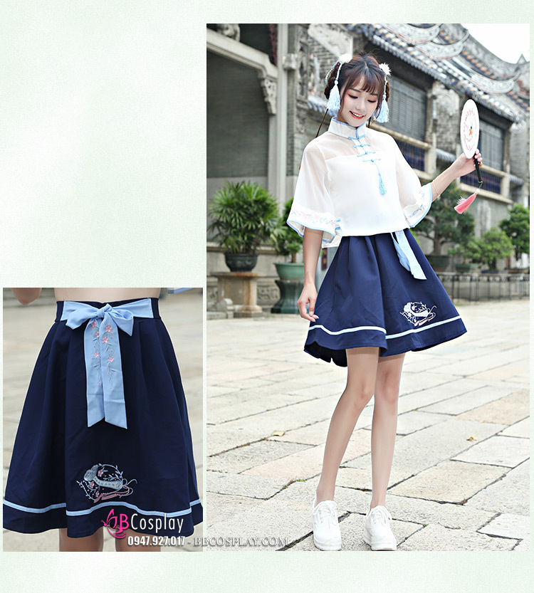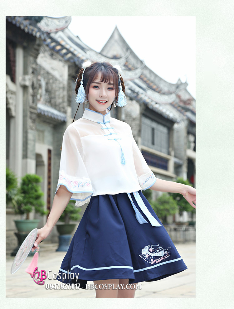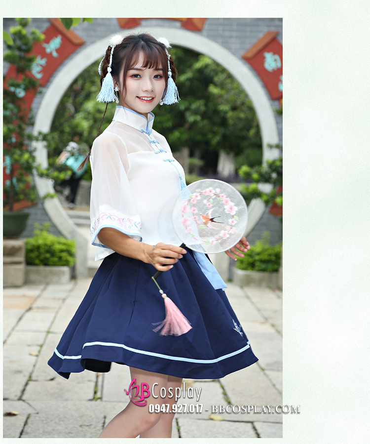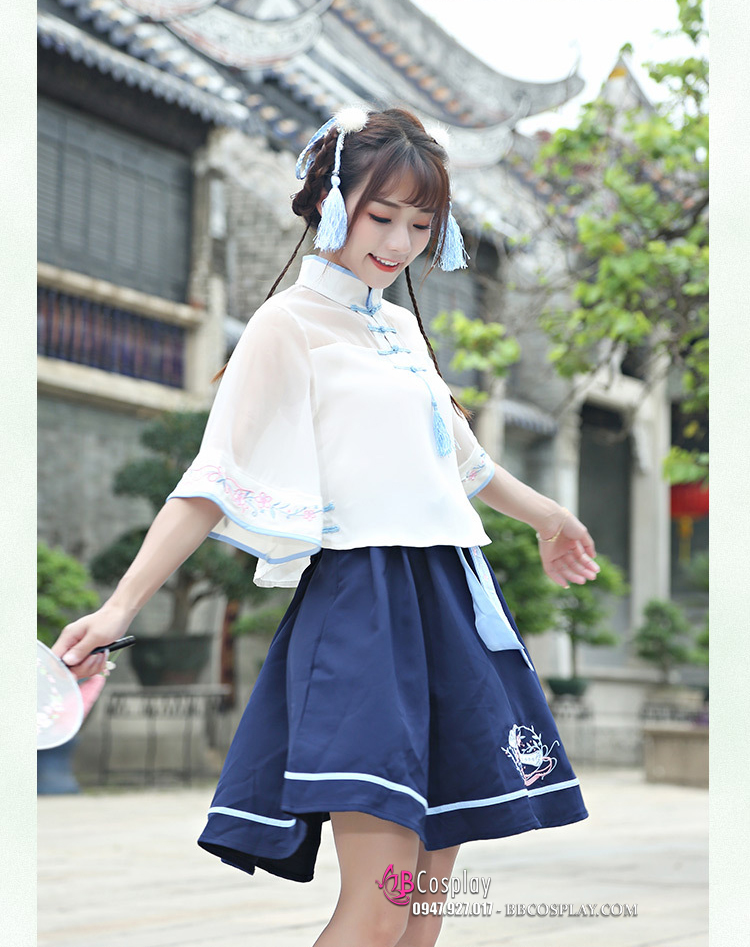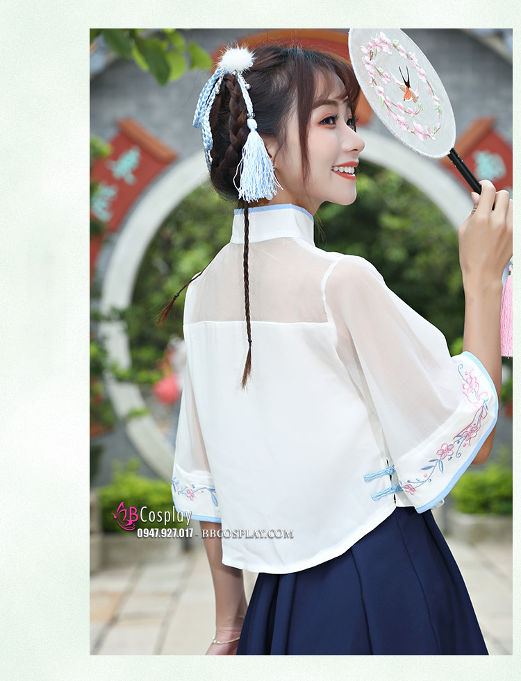 Hán Phục Cách Tân Áo Trắng Váy Xanh Cổ Tàu