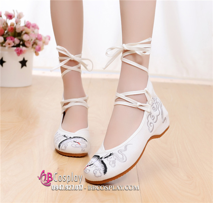 Giày Thêu Hạc Màu Trắng Dây Cột Cao - Đế 3.5Cm