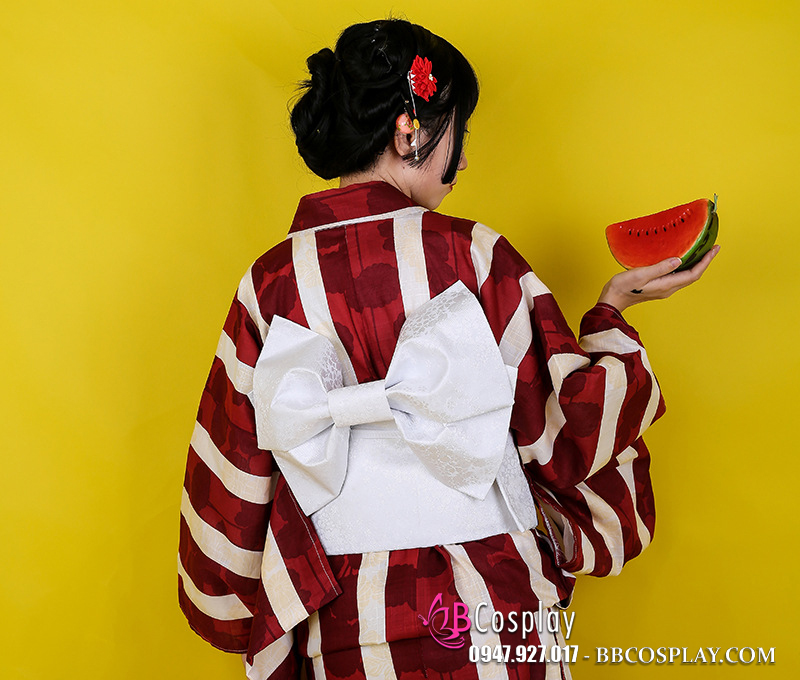 yukata đỏ sọc + obi như hình + đai phụ