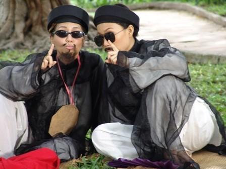 áo dài gấm trắng bên trong + áo the (voan kính) đen + khăn đóng + quần phi trắng