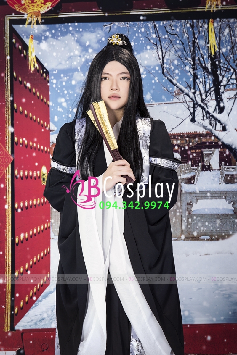 lớp áo lót phi bóng trắng + lớp áo voan nhung đen + lớp áo gấm ngoài + váy dài + đai