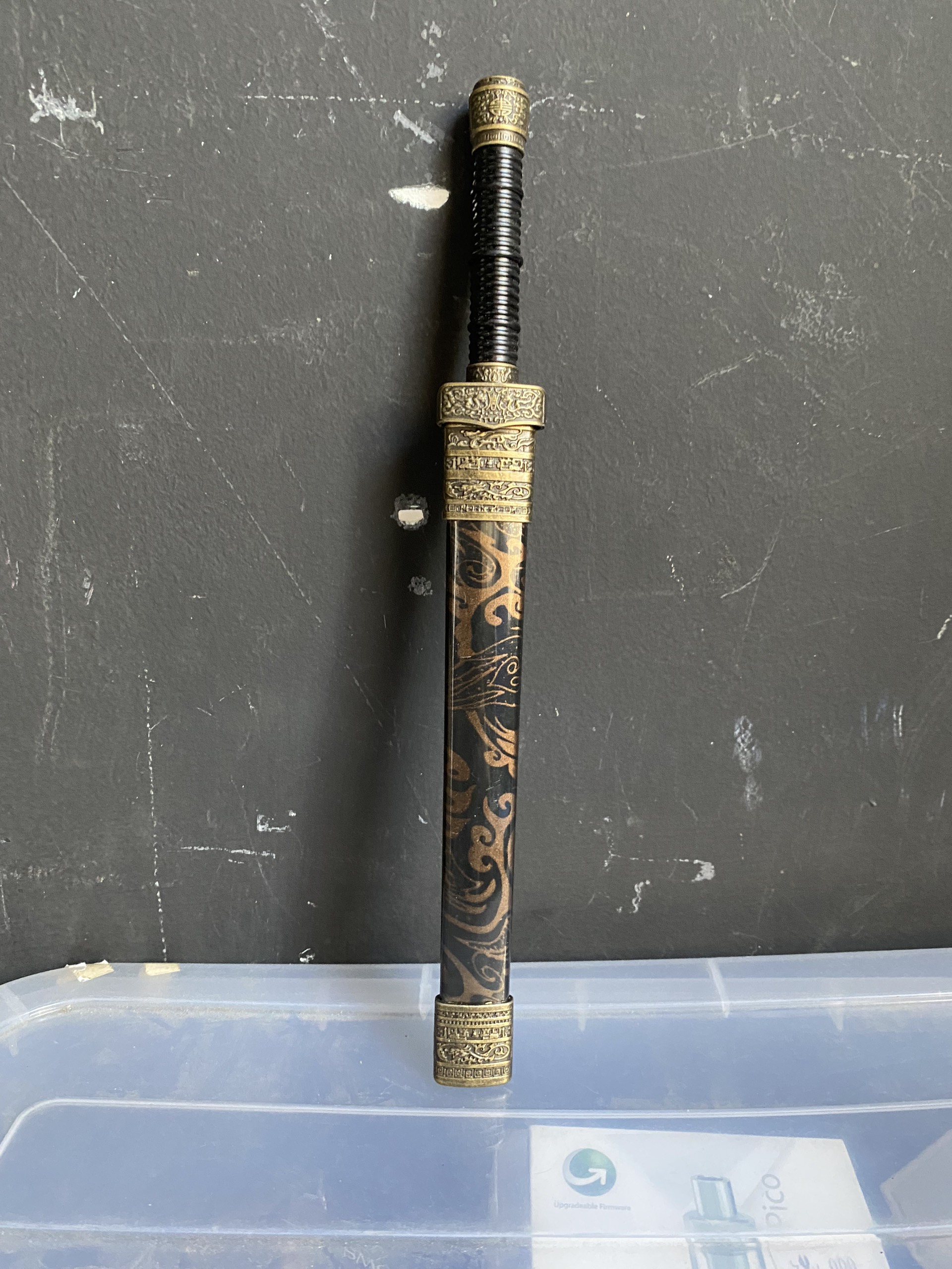1 thanh kiếm kim loại có bán kiếm đai màu nâu đồng 29cm