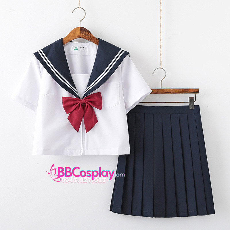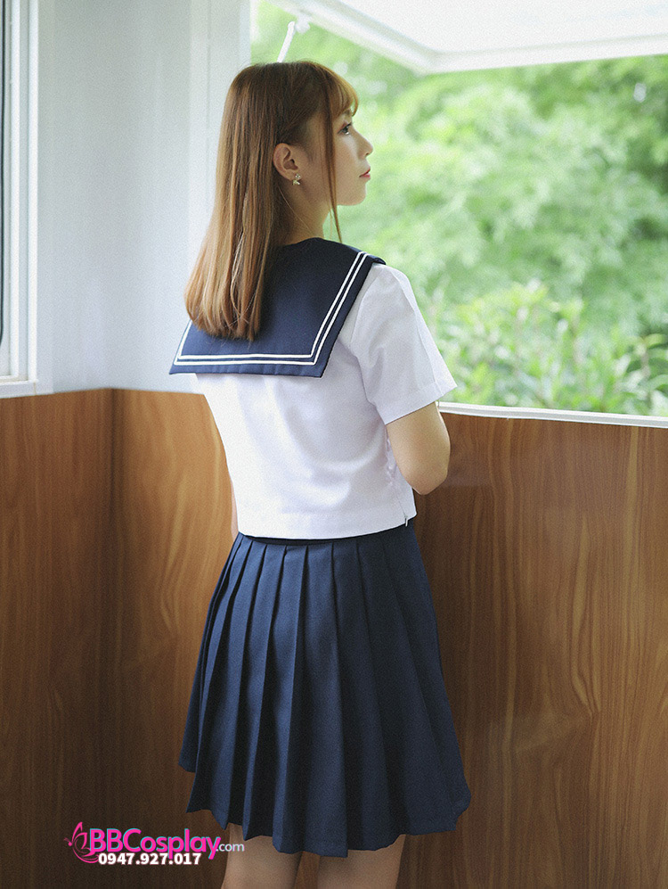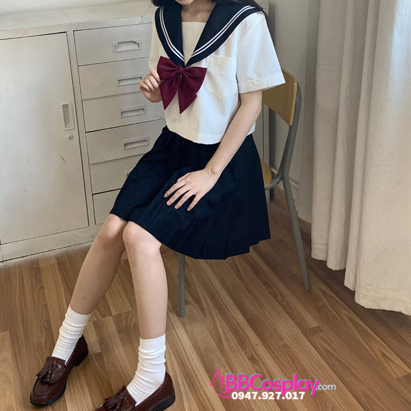 Đồ Seifuku Nữ Sinh Nhật Áo Trắng 2 Sọc - Váy Xanh Đen Cơ Bản