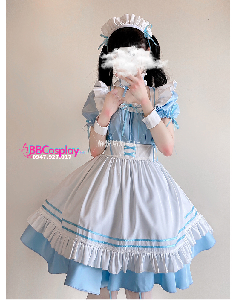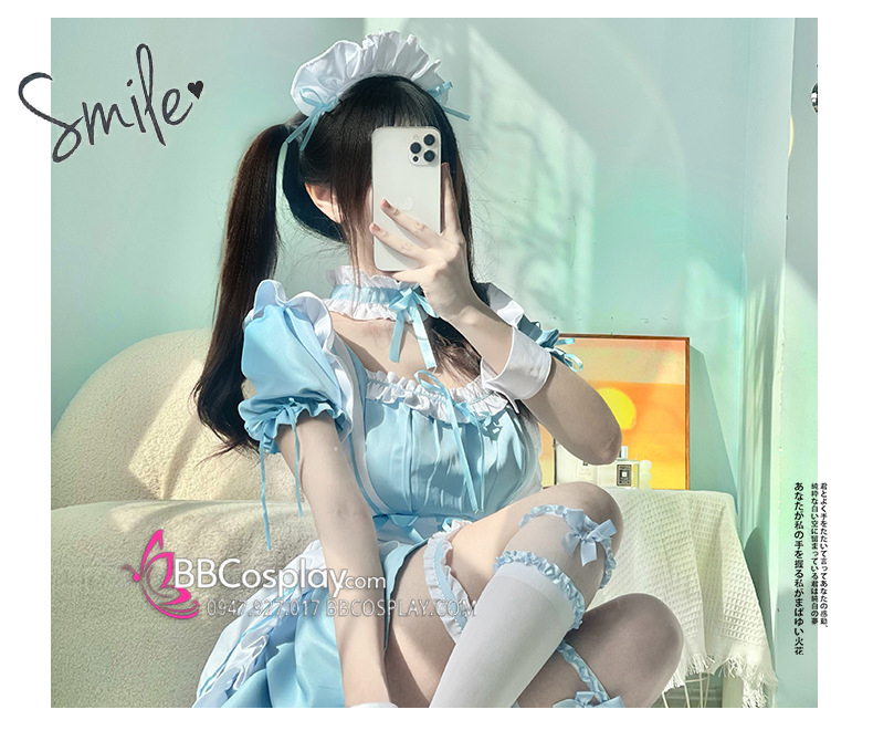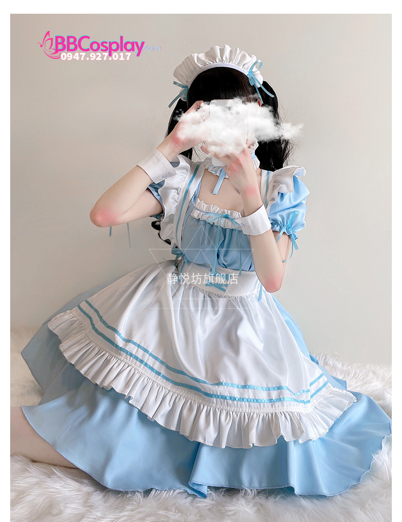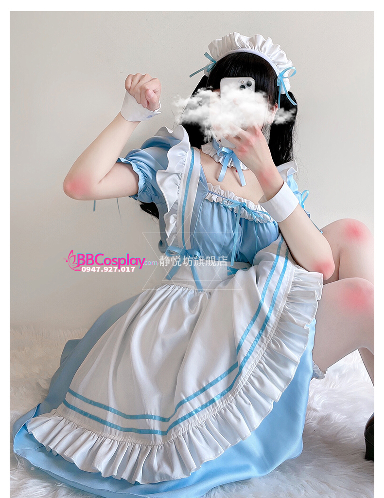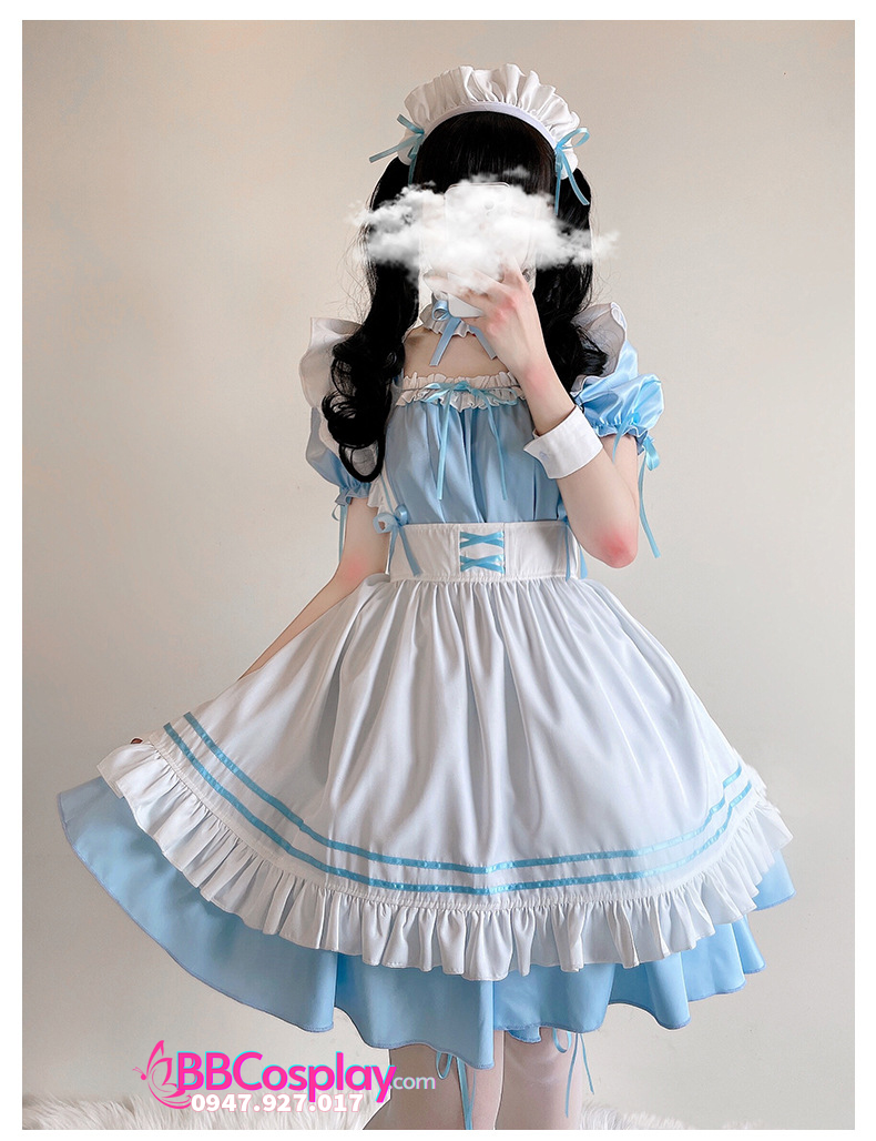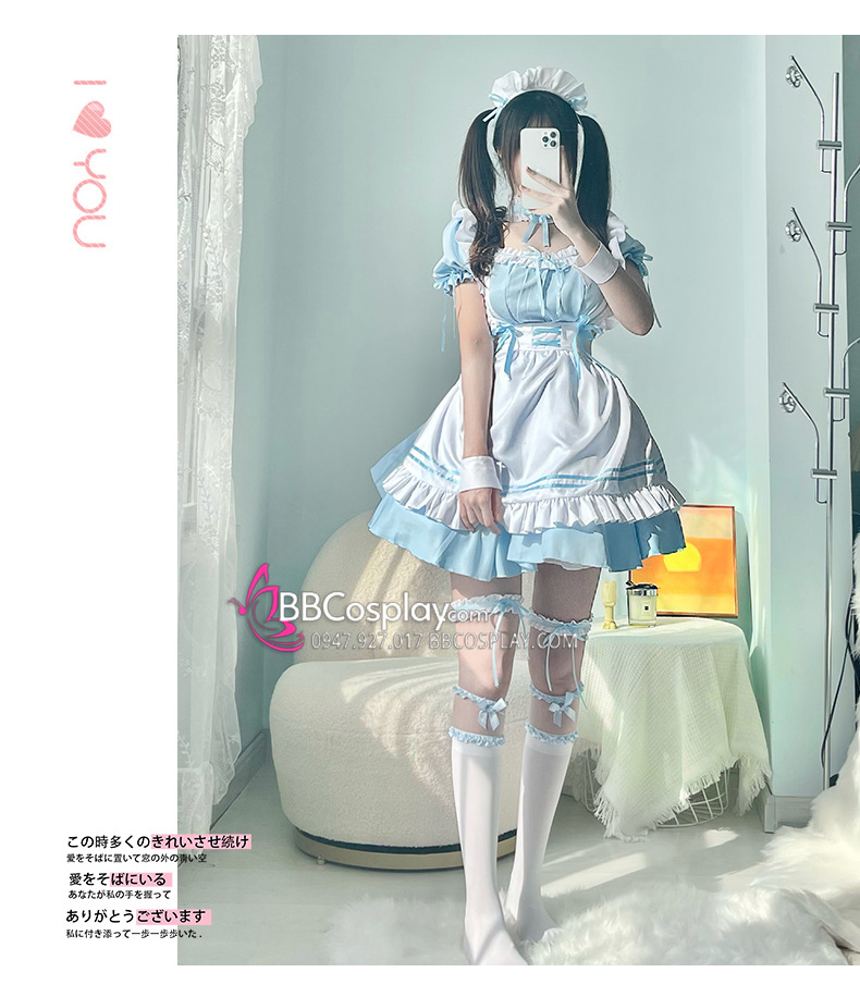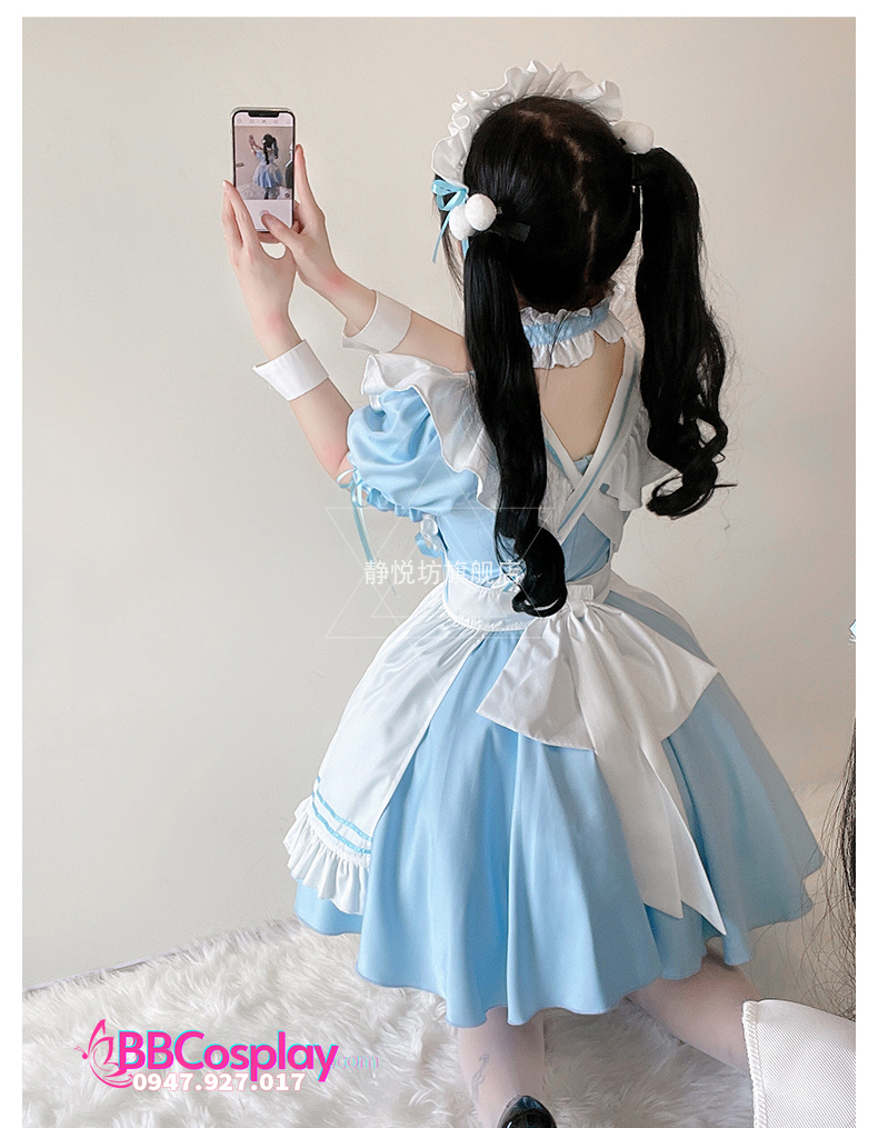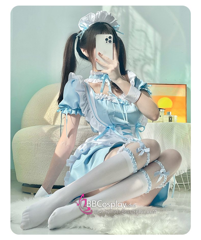 Đồ Nàng Hầu Maid Xanh Dương Tạp Dề Trắng Kèm Nhiều Nơ