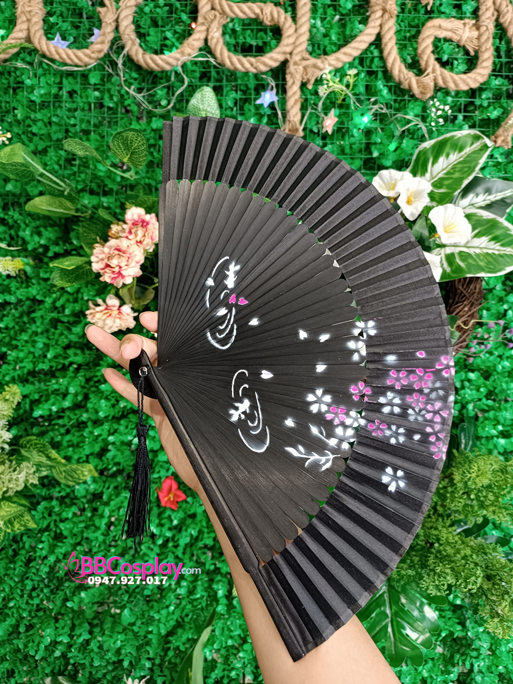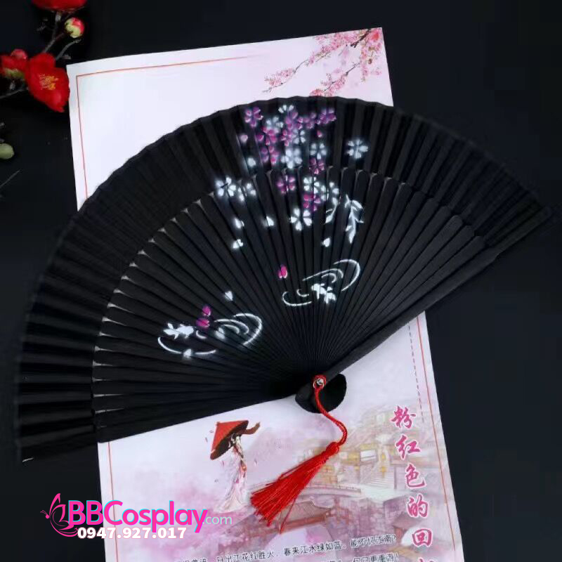 Quạt Gỗ Nhật Đen Hoa Đào Giá Rẻ