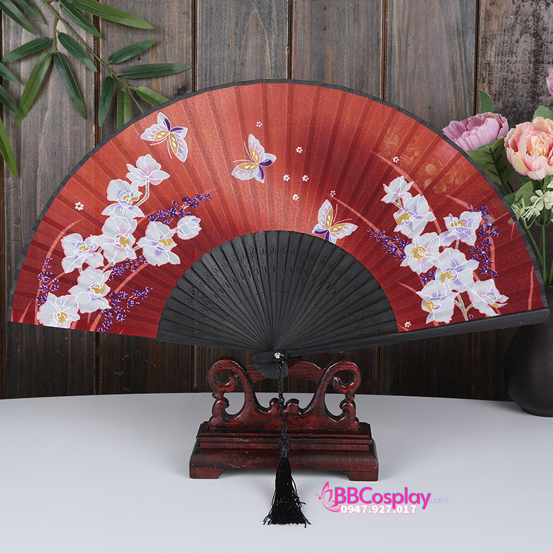 Quạt Xếp Nền Đỏ Hoa Và Bướm Trắng