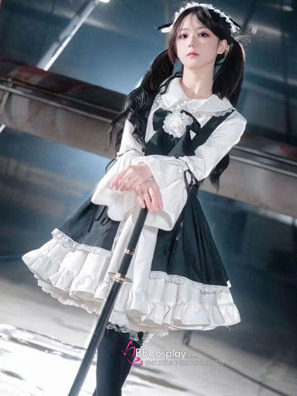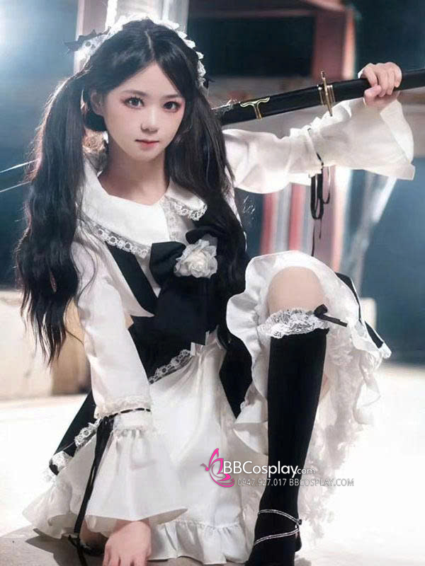 Trang Phục Lolita Đen Trắng Thêu Hoạ Tiết Chân Mèo Kèm Chuông Cổ