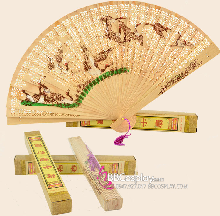 Quạt gỗ Trung Quốc, màu gỗ trợ nhiên, có mùi trầm hương hoặc mùi tràm. Hương thơm dịu nhẹ! in 11 con Sếu màu