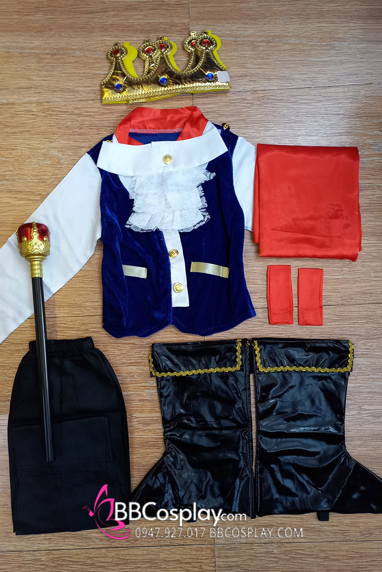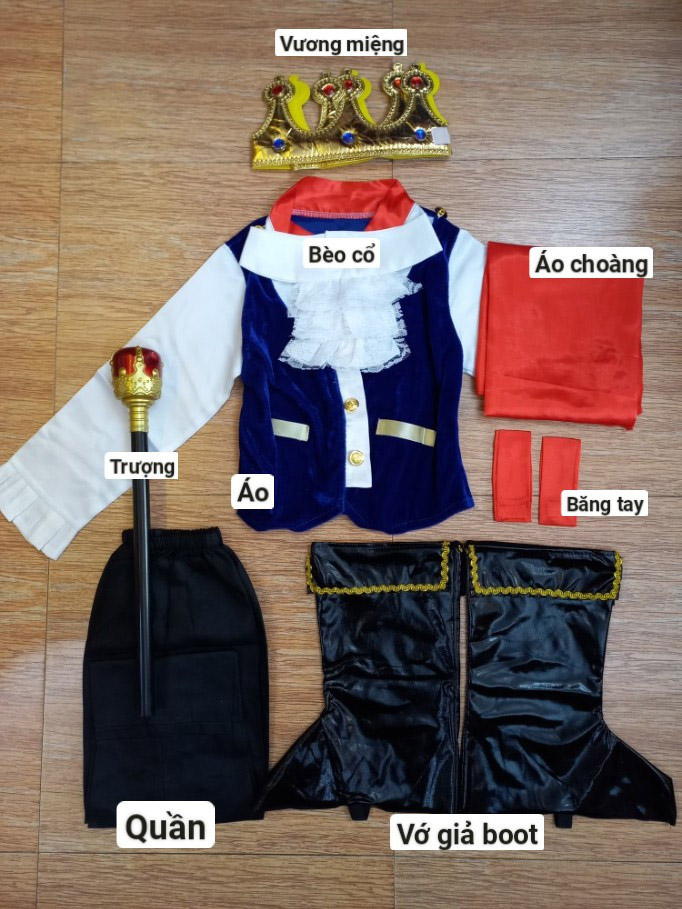 áo + quần + bèo cổ + choàng + vương miện + giả giầy + gậy