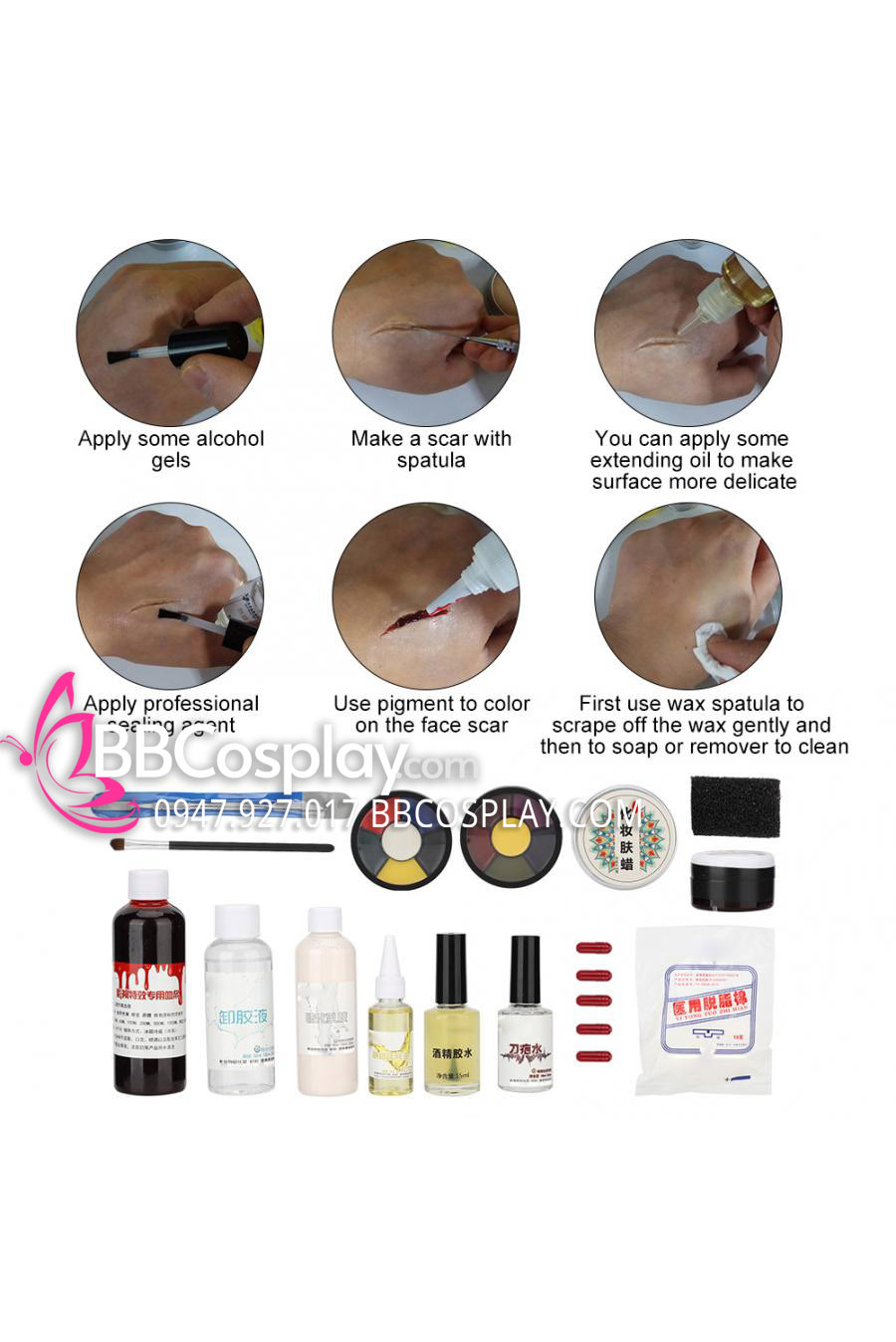 Gói hàng bao gồm: Sáp trang điểm + keo dán + keo phủ bảo vệ + màu vẽ + máu gải