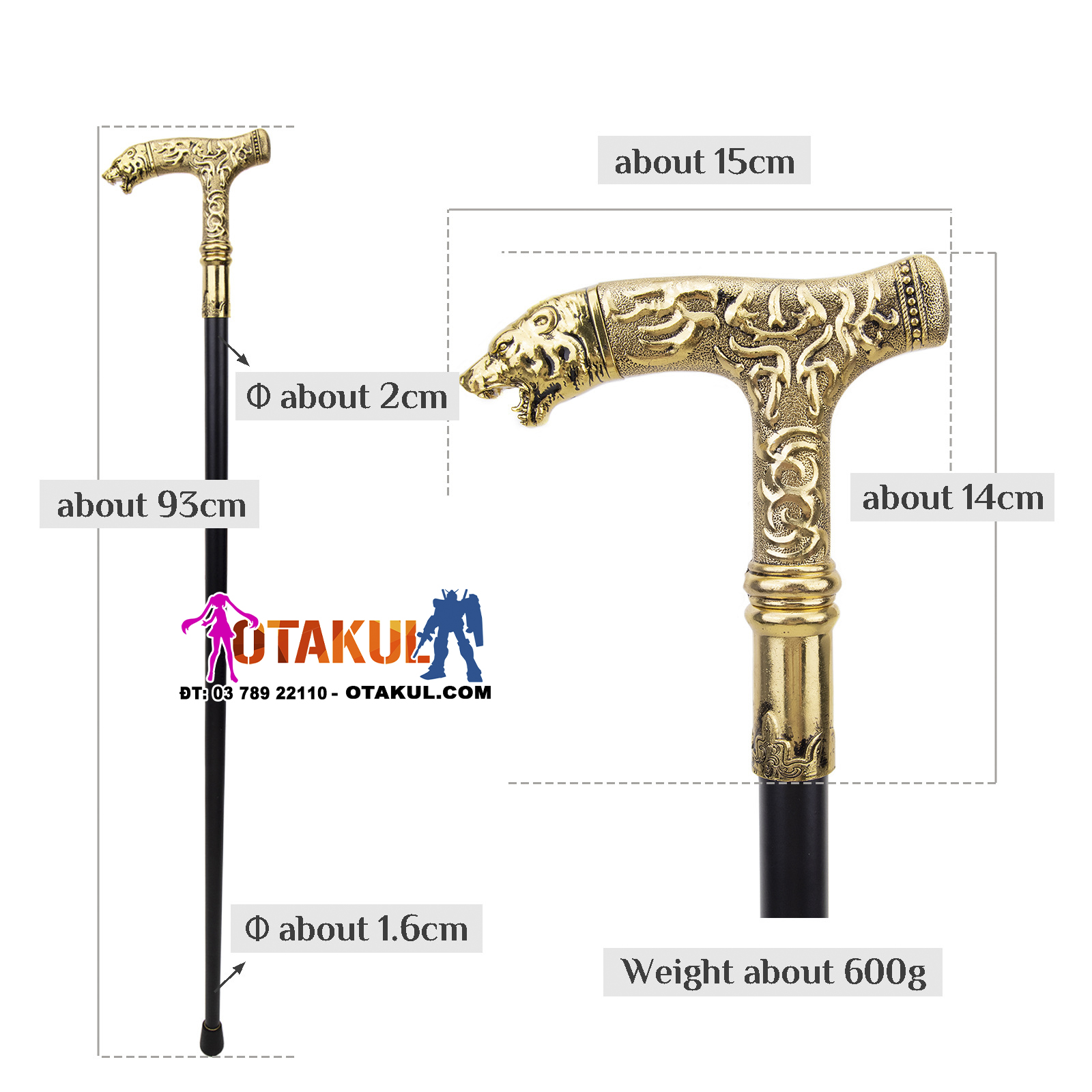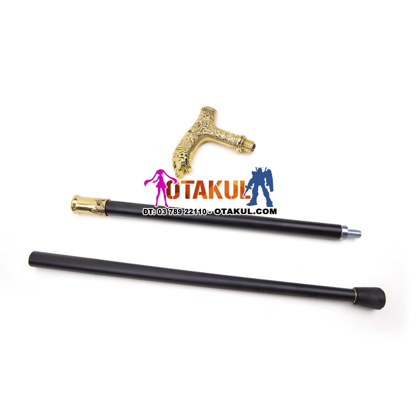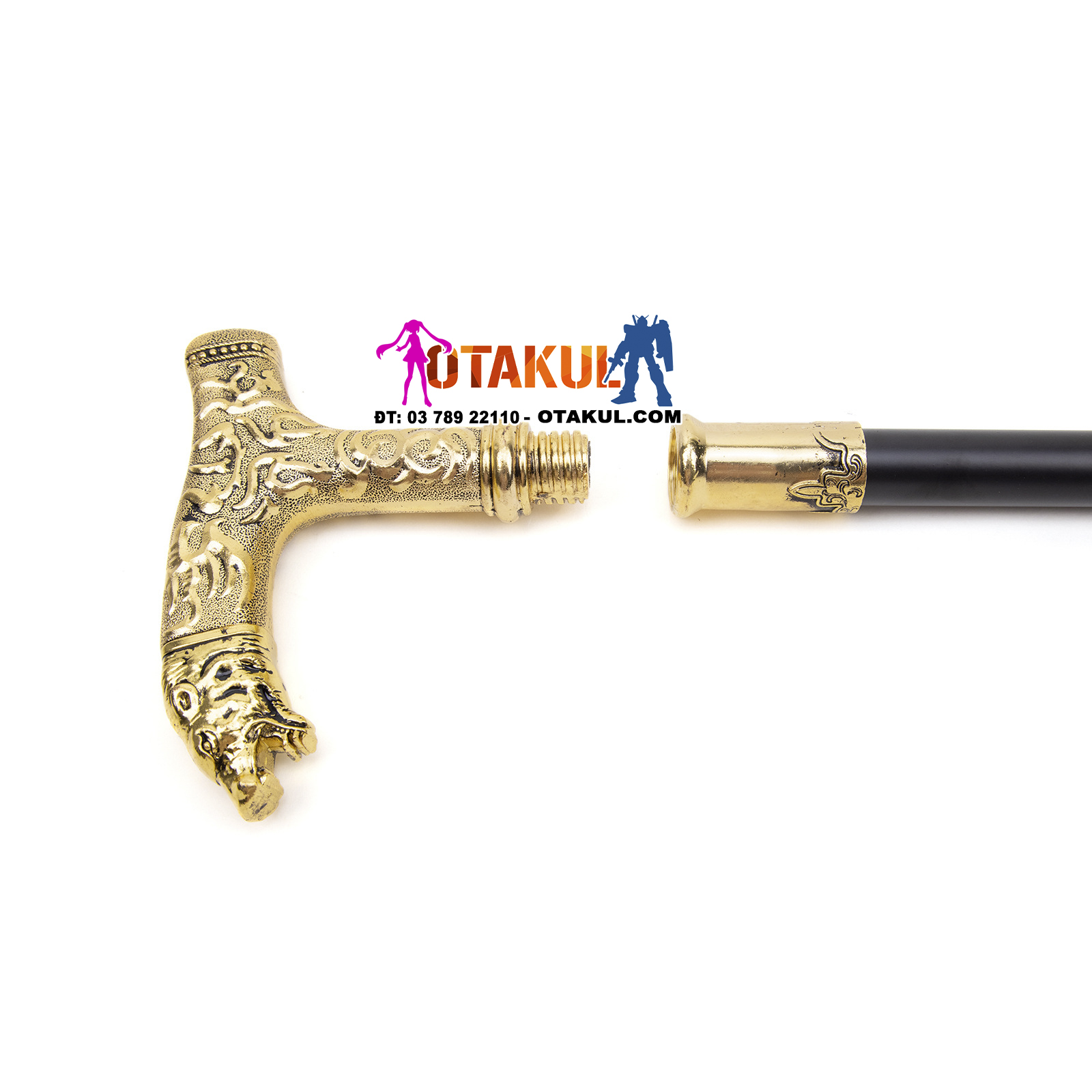 Thông số kỹ thuật: tổng chiều dài 92CM Chất liệu: sắt, nhôm Trang phục: Vỏ bọc sơn mài bóng mờ màu đen mạ hợp kim Nghề thủ công: Đầu gậy có thiết kế dập nổi đẹp mắt Phương pháp cố định thân kiếm là kiểu chèn và vặn, dưới đáy gậy có miếng đệm cao su chống trượt để gia cố và chống mài mòn. Hộp đóng gói Công dụng; trang trí nhà cửa, sưu tầm quà tặng, đạo cụ quay phim và truyền hình, studio chụp ảnh, tập võ