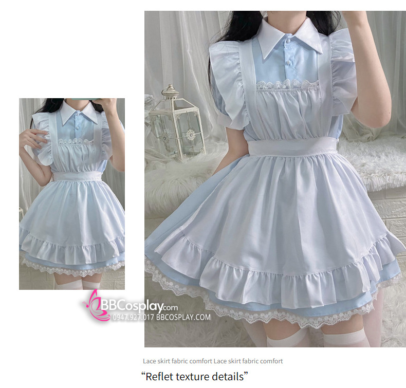 Đồ Nàng Hầu Maid Xanh Dương Tạp Dề Trắng Kèm Nhiều Nơ