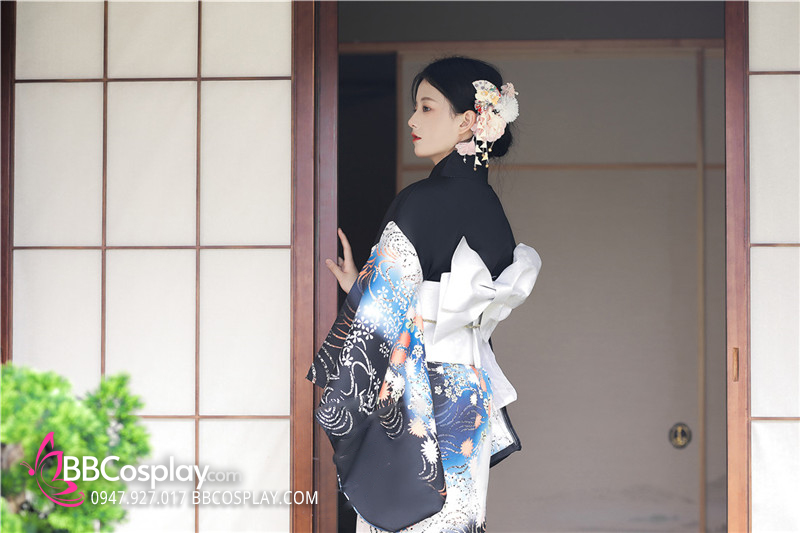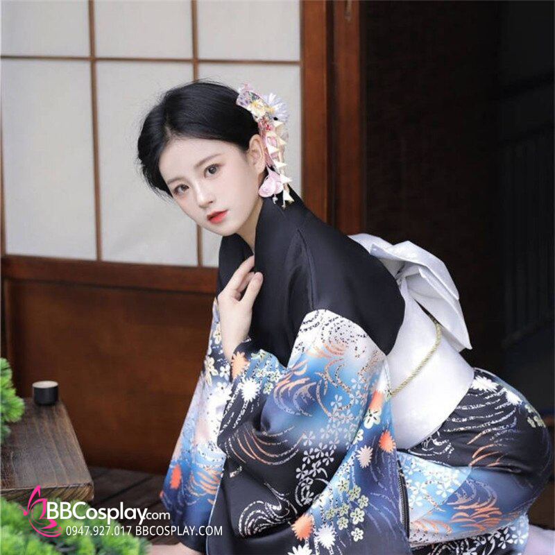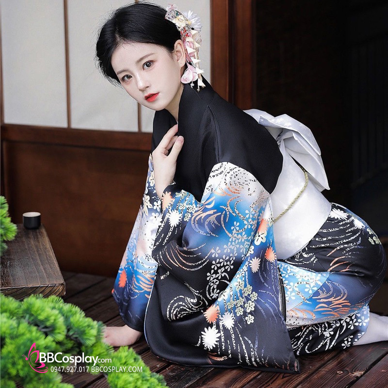 Áo Yukata Mùa Hè Nền Đen Tặng Kèm Thắt Lưng