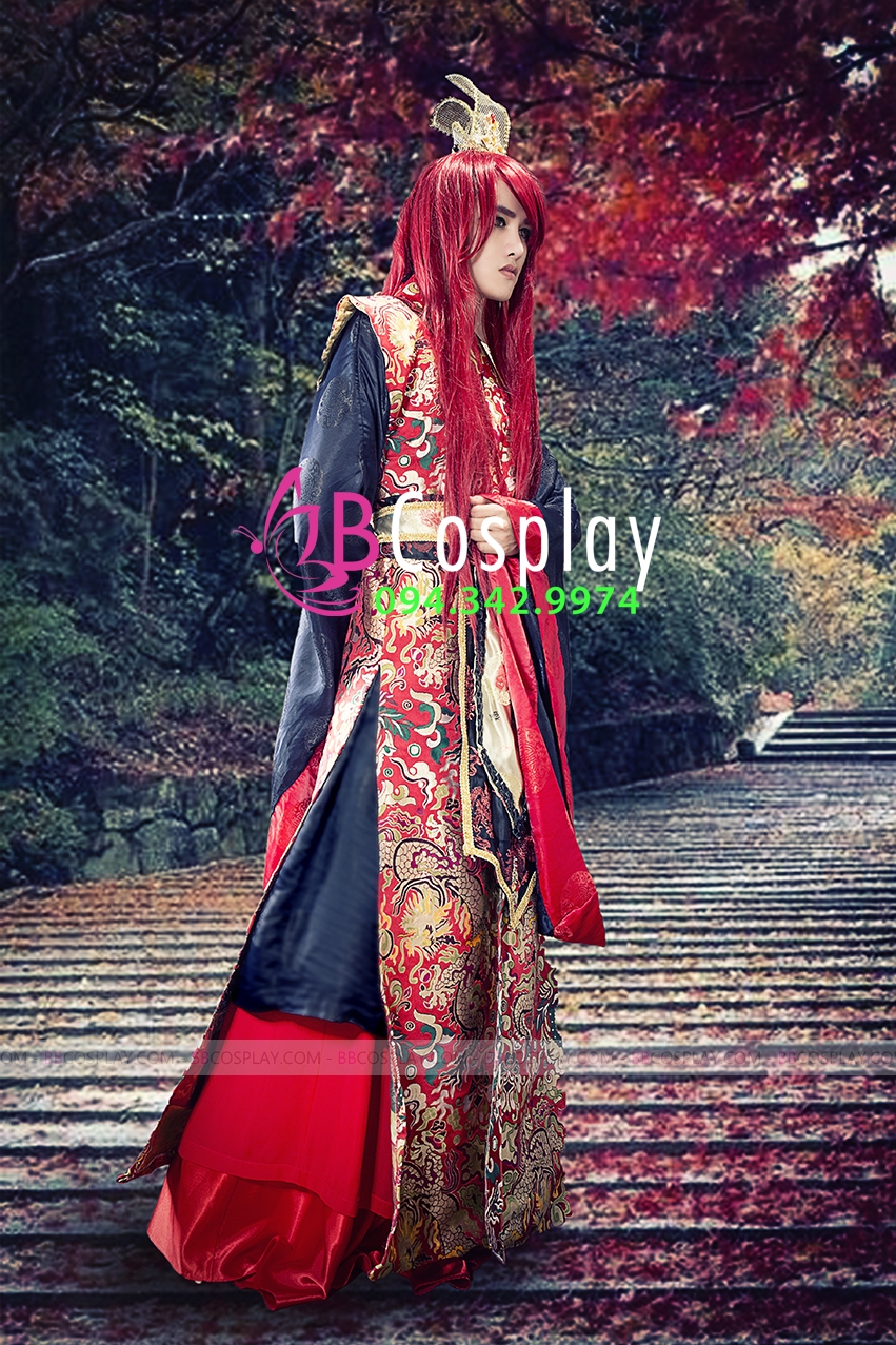 váy dài + áo gấm đen dài + áo gấm đỏ rồng + đai + mão