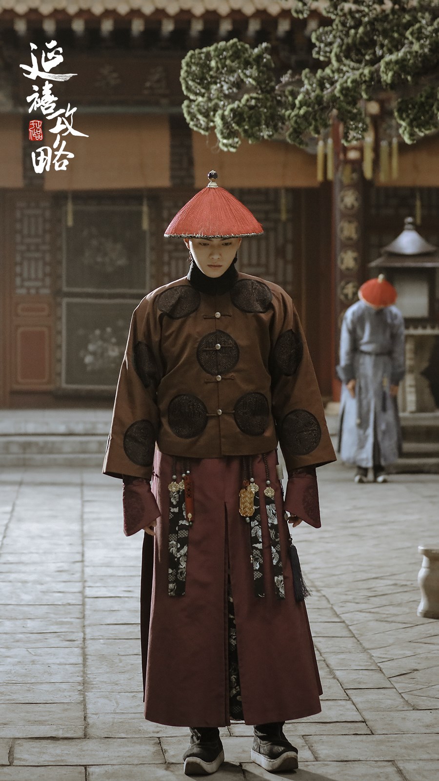 Thành phần: áo gấm nâu + váy đỏ + nón chóp