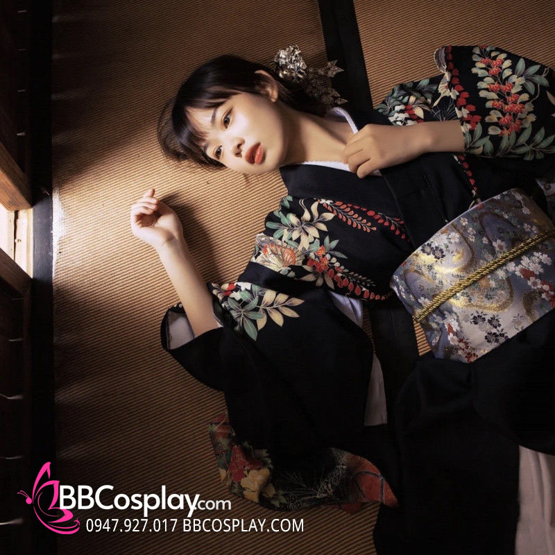 Kimono Nhật Nền Đen Bướm Cam