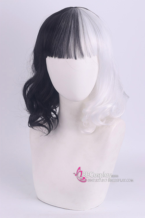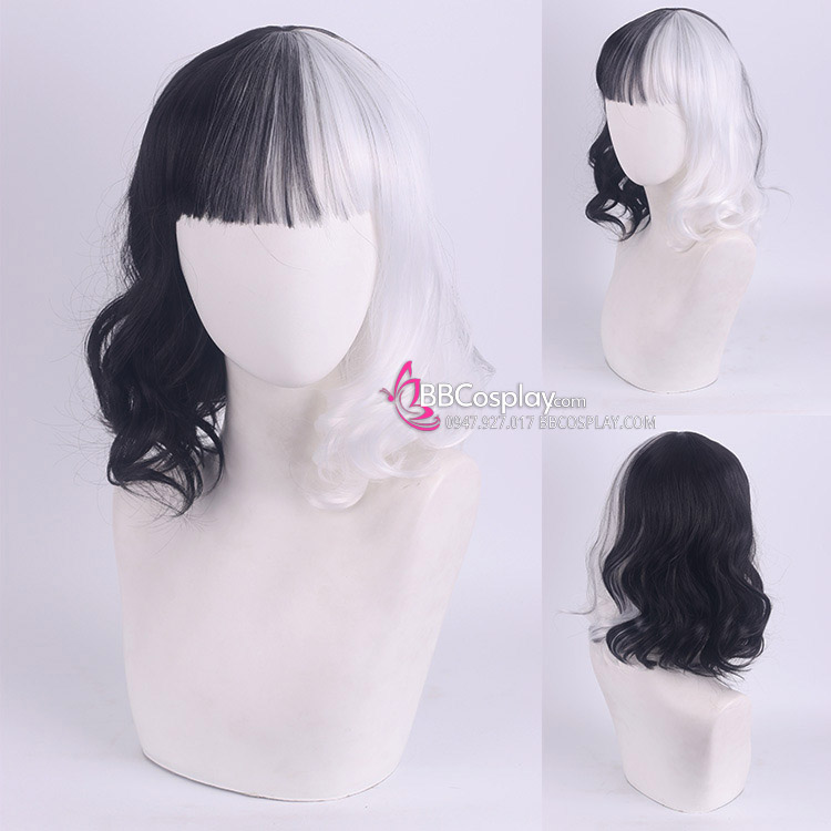 Tóc Giả Ngắn Mái Ngang Nữa Trắng Đen Đuôi Gợn Sóng
