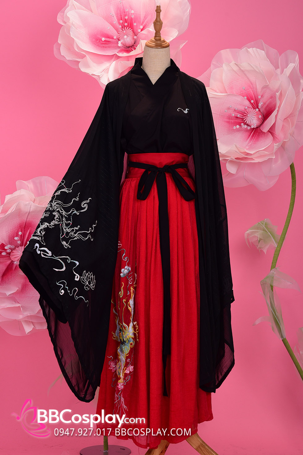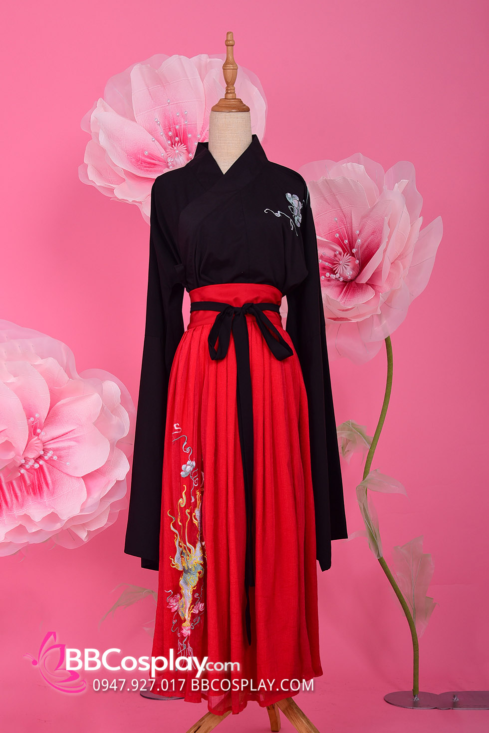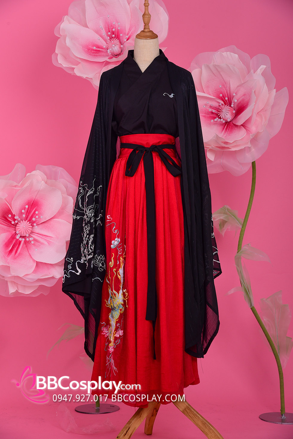 áo đen thêu rồng + chân váy xòe đỏ ( không có khoác voan )