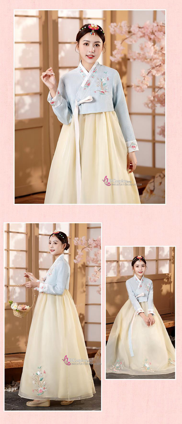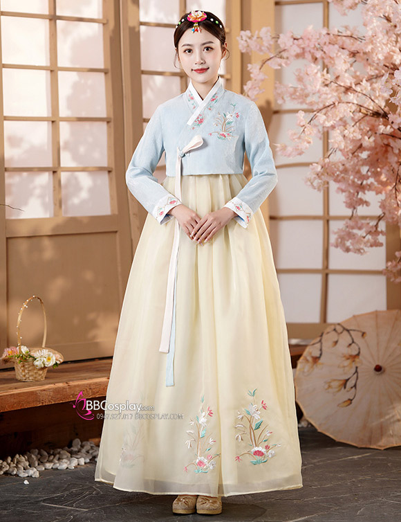 Hanbok Áo Xanh Cổ Thêu Váy Voan Vàng Thêu Hoa Mẫu Mới