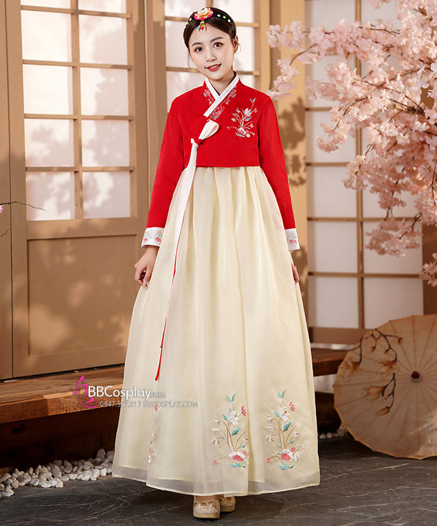 Hanbok Áo Đỏ Cổ Thêu Váy Voan Vàng Thêu Hoa
