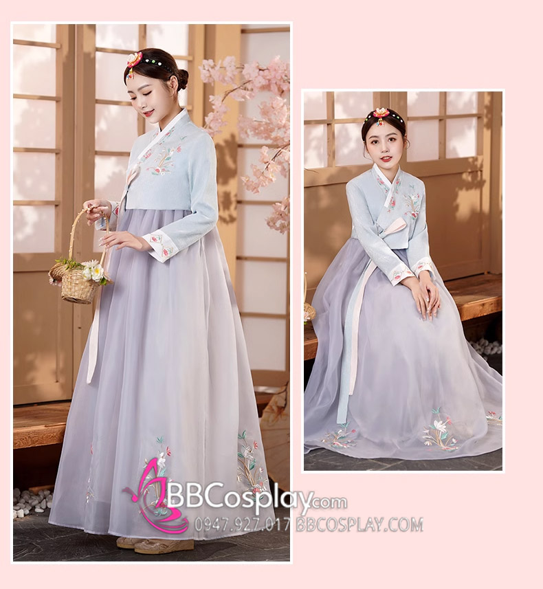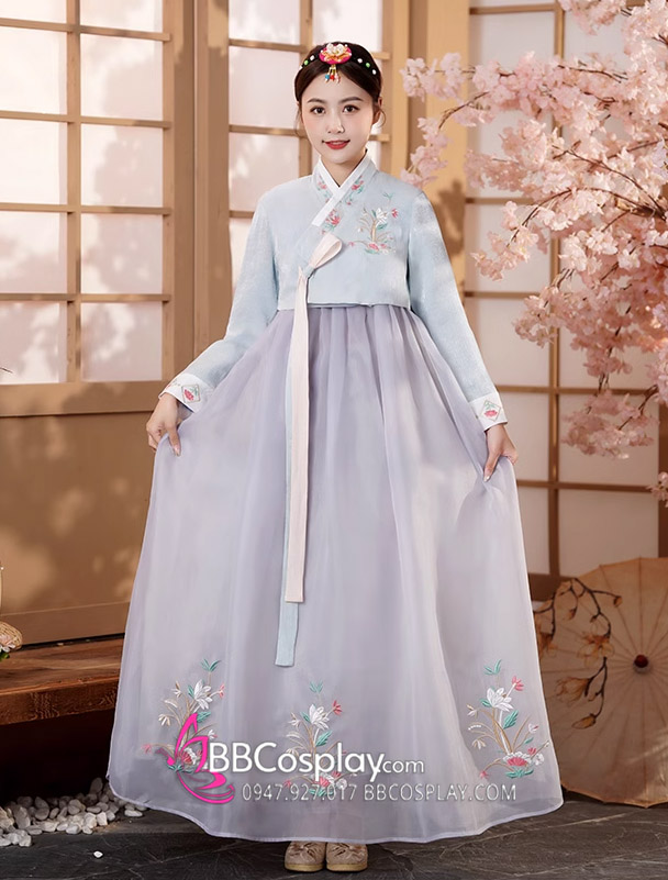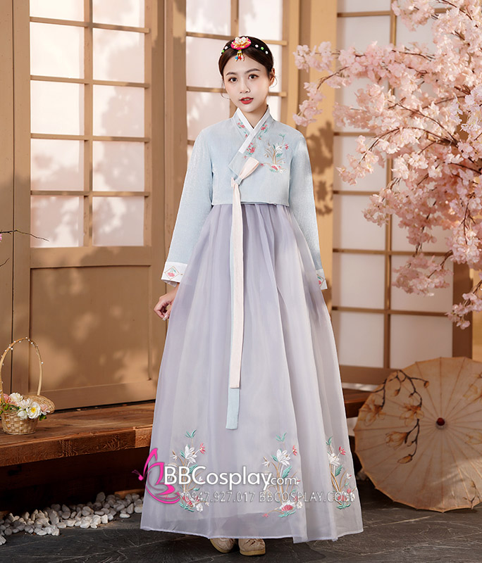 Hanbok Áo Xanh Cổ Thêu Váy Voan Xám Thêu Hoa Mẫu Mới