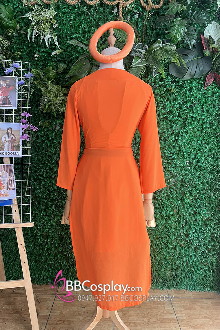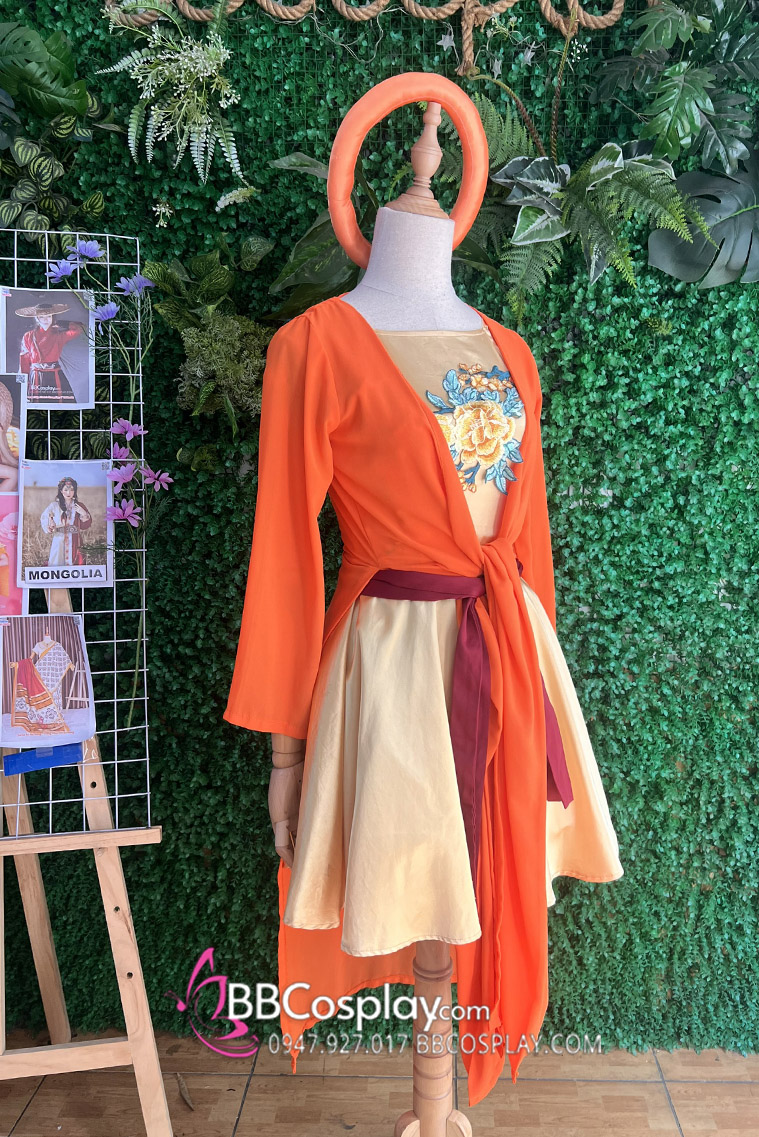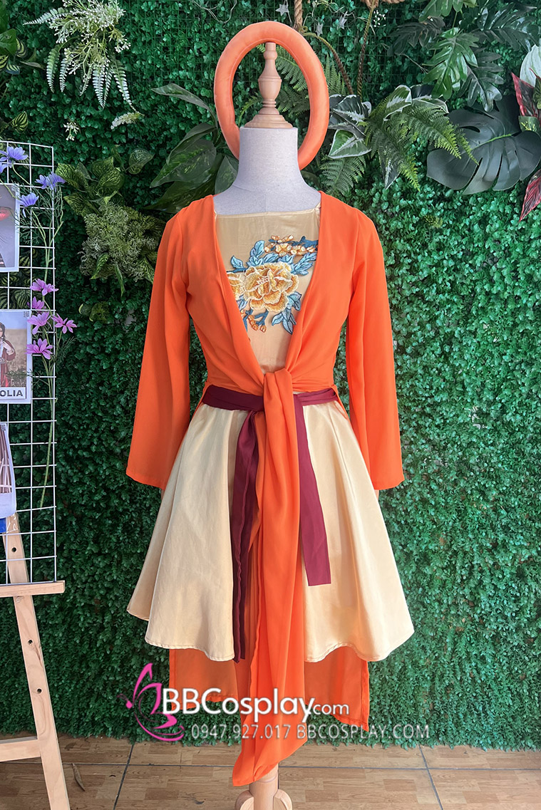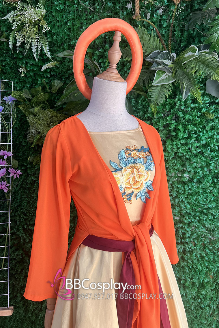 Thành phần: váy vàng cổ yếm + áo voan cam + mấn