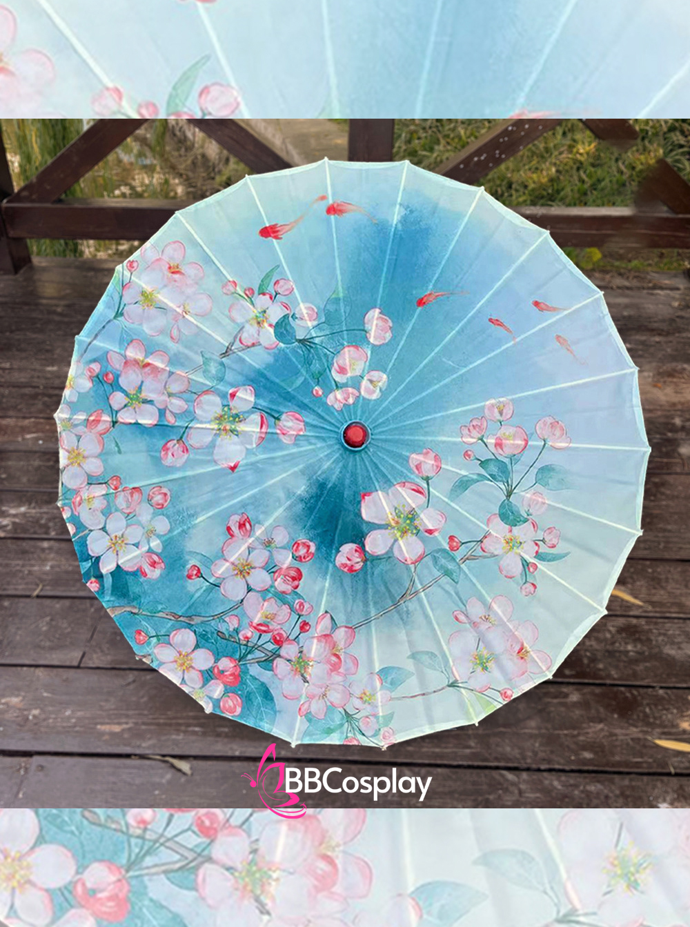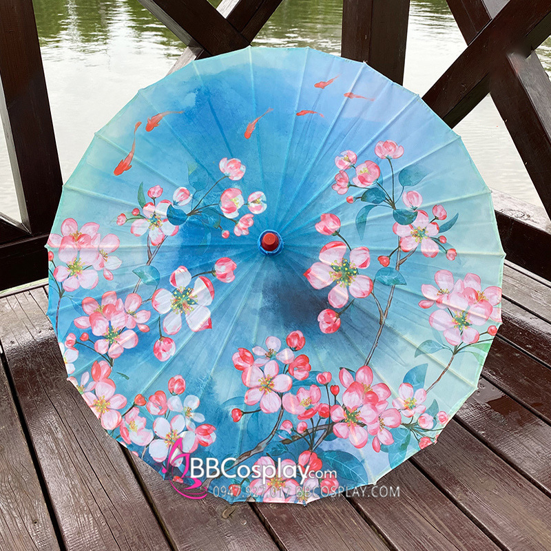 Dù Vải Cổ Phong Nền Xanh Dương Hoa Và Cá Vàng