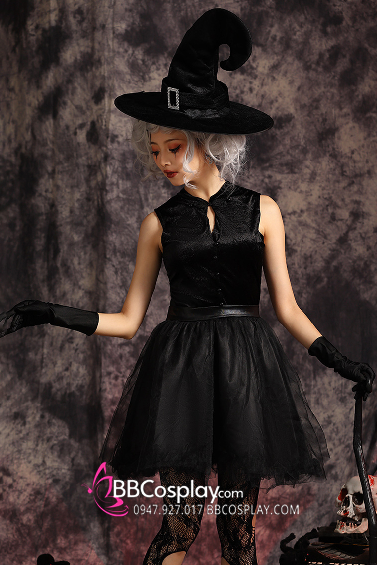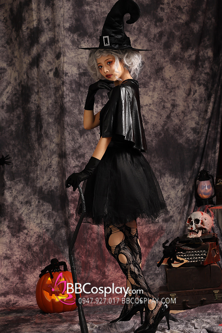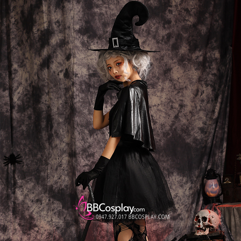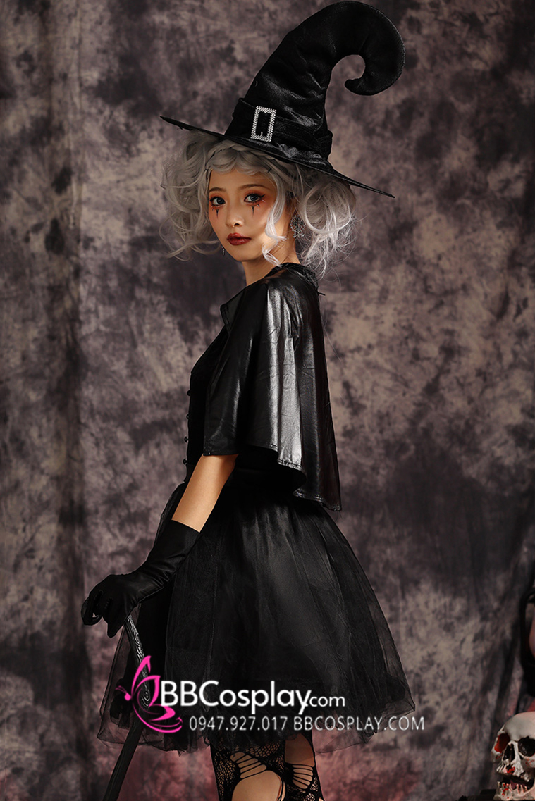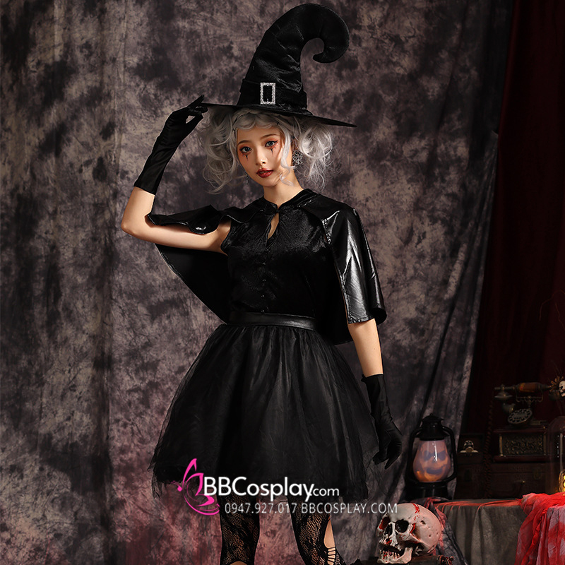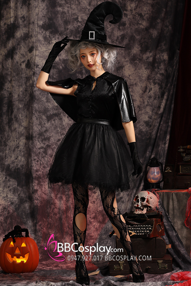 Thành phần: đầm cổ trụ + choàng vai da + nón phù thuỷ đẹp + cặp găng tay đen