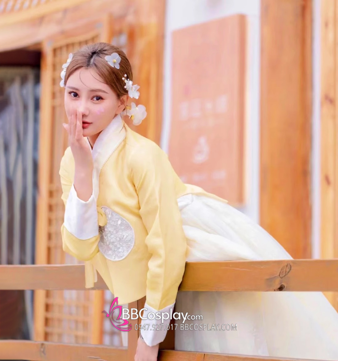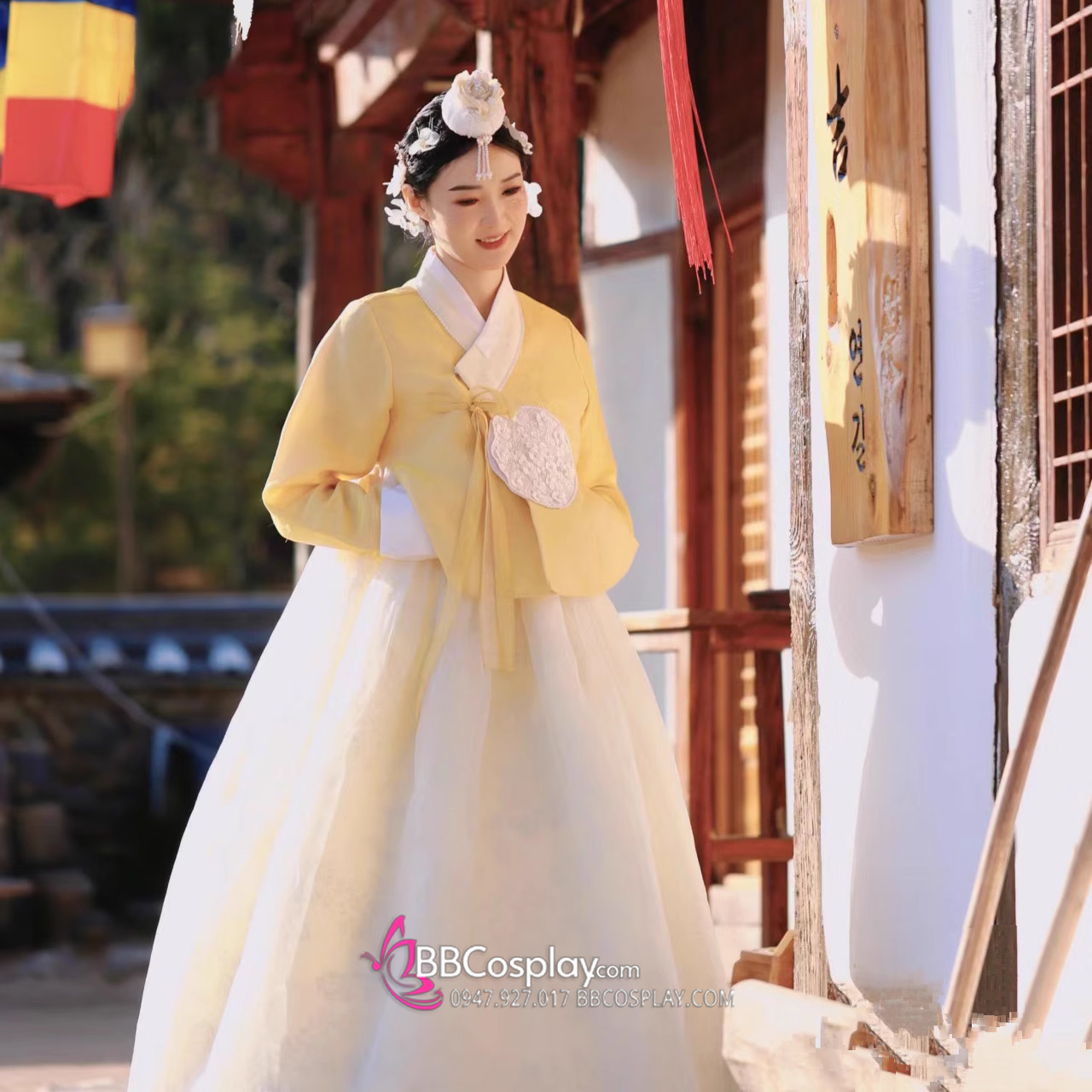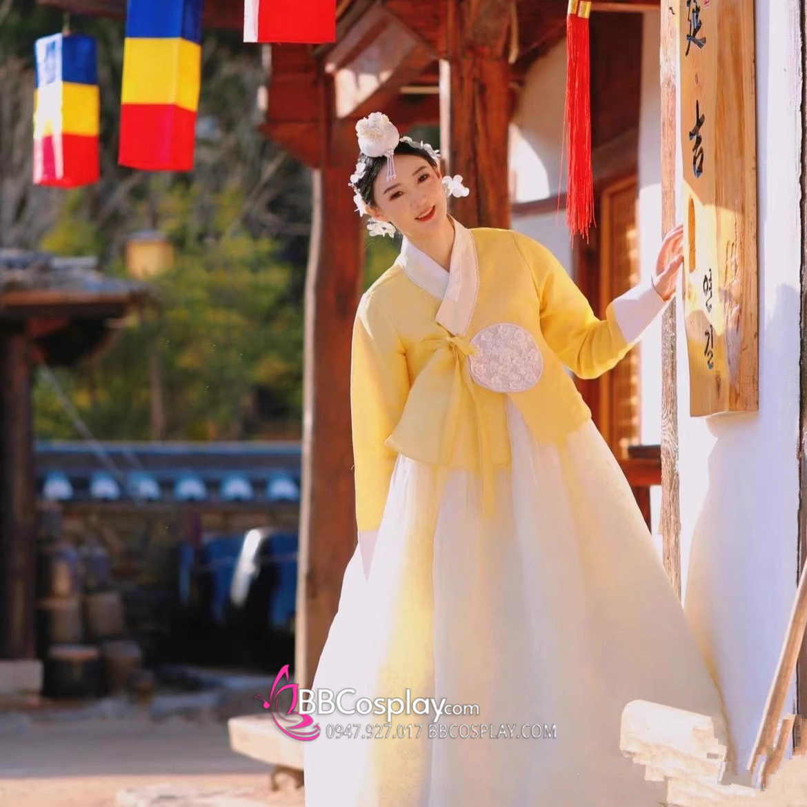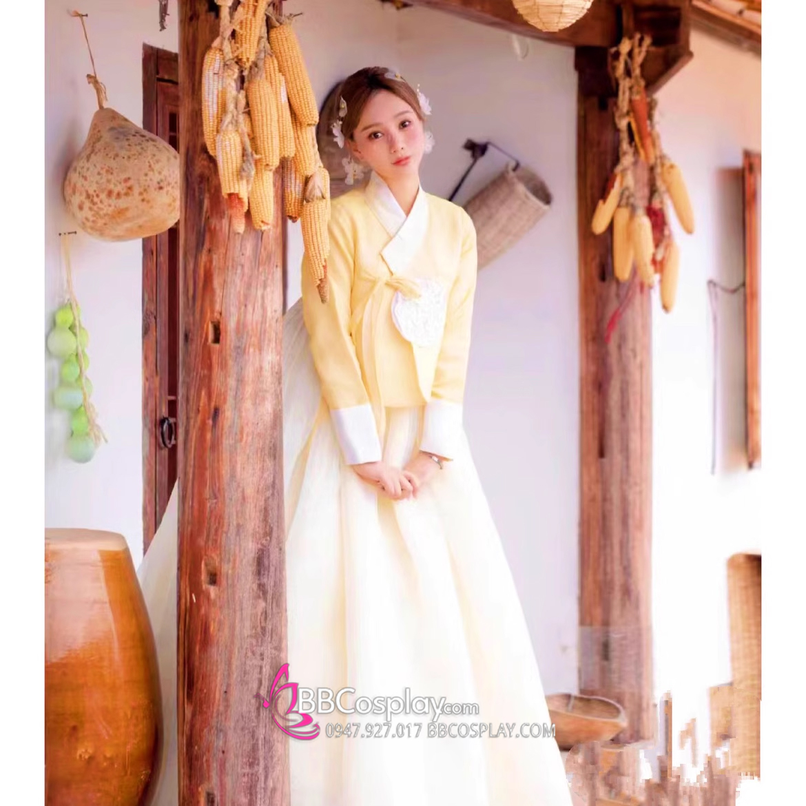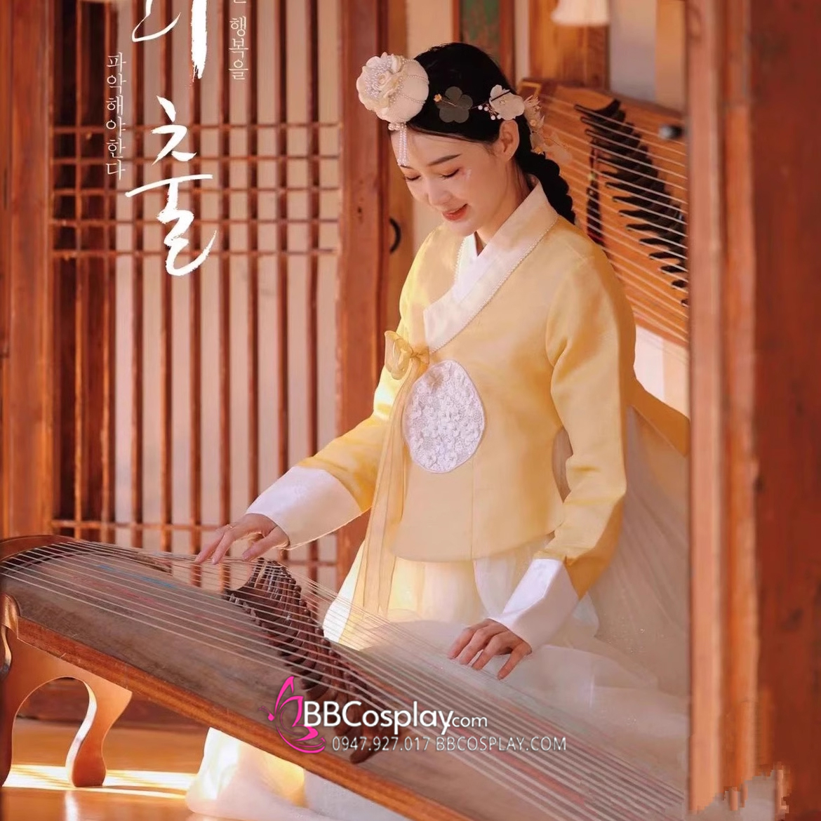 Hanbok Gấm Cao Cấp Chuẩn Hàn Áo Vàng Váy Trắng Kem