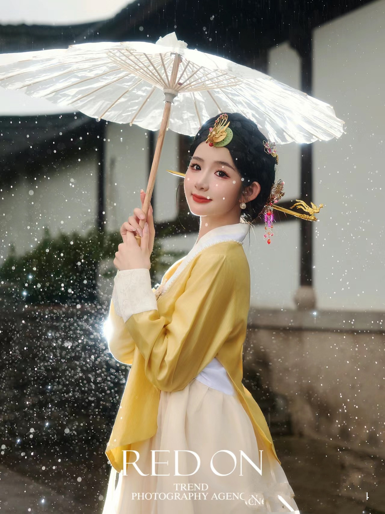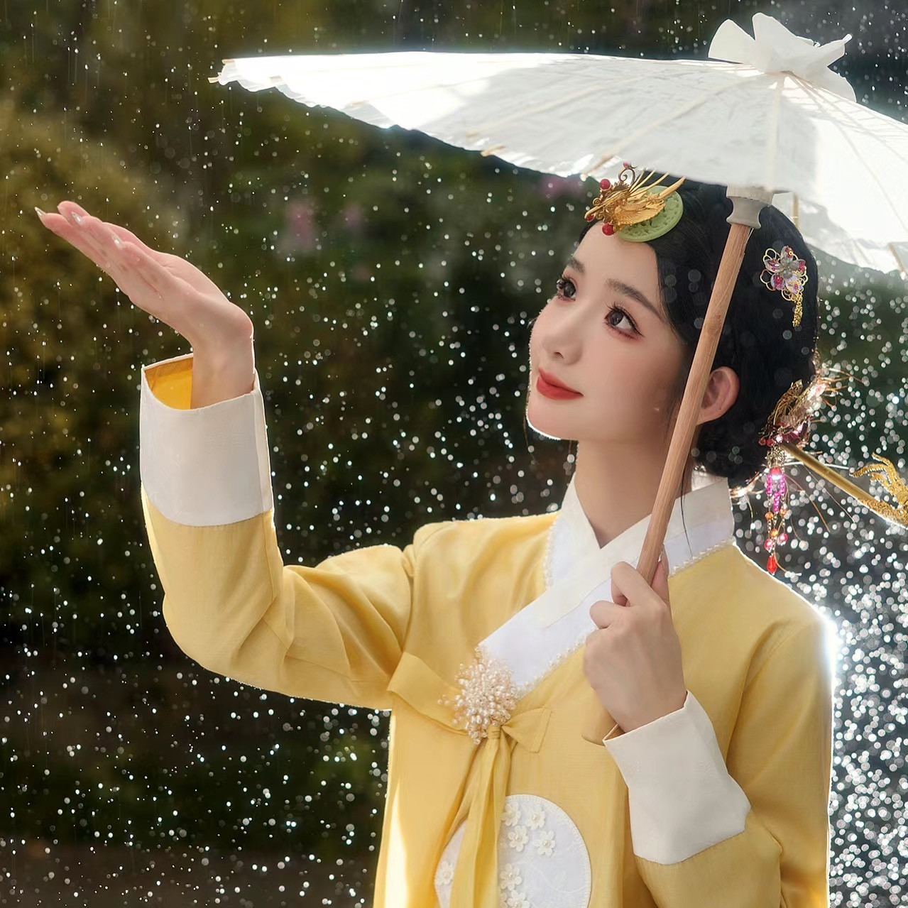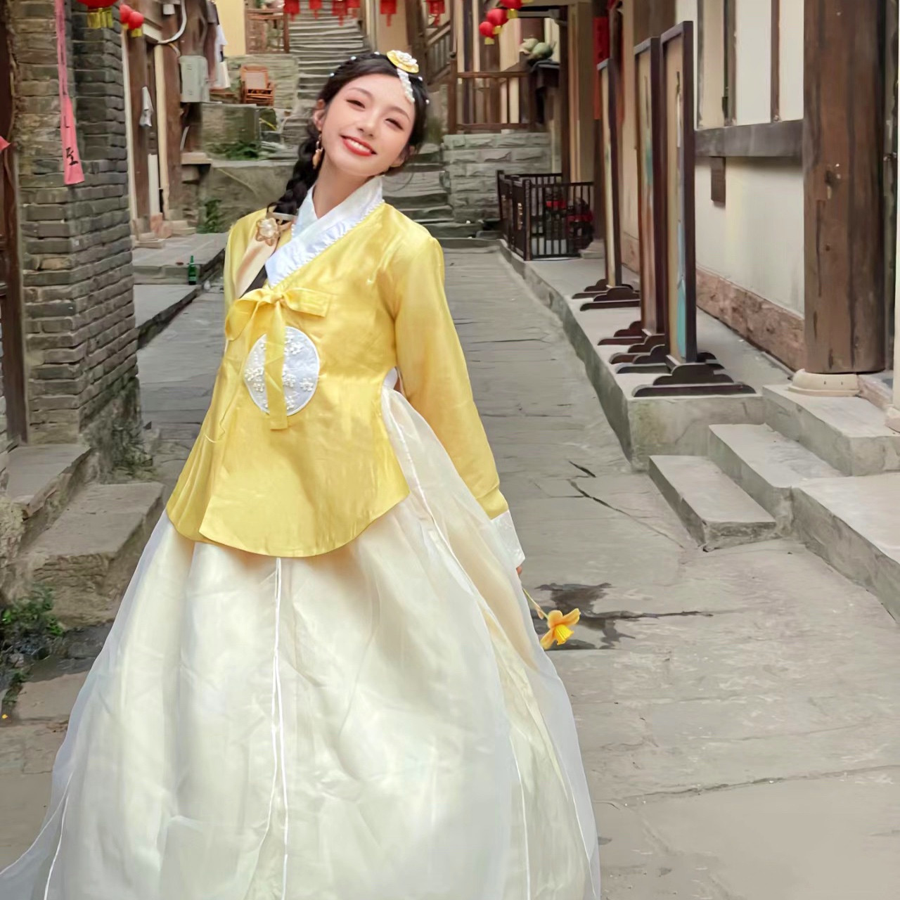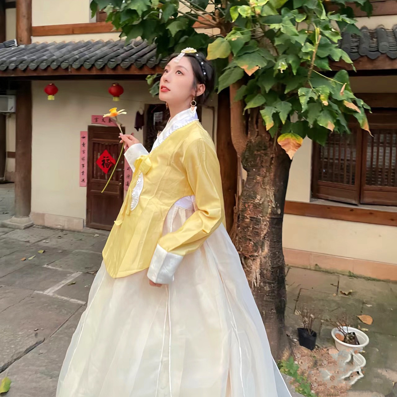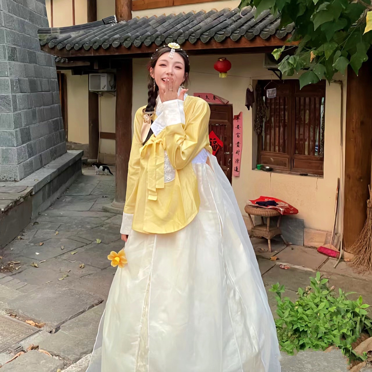 Hanbok Gấm Cao Cấp Chuẩn Hàn Áo Vàng Váy Trắng Kem