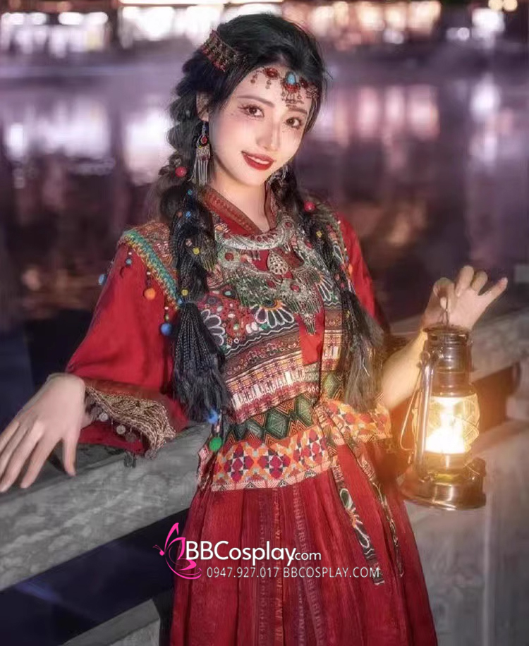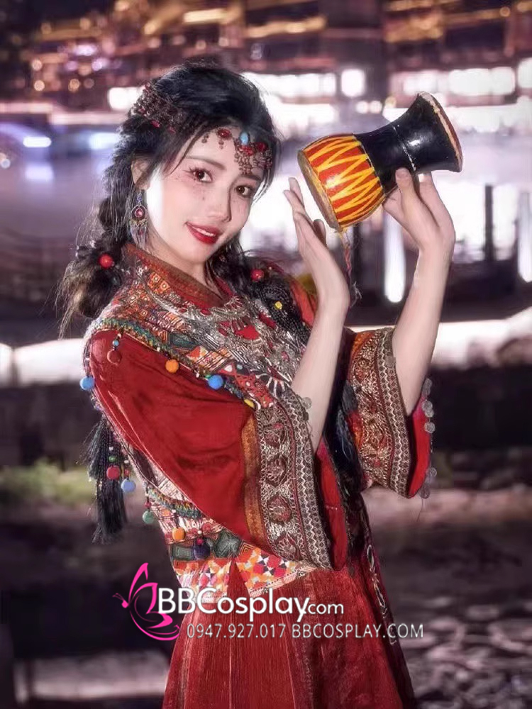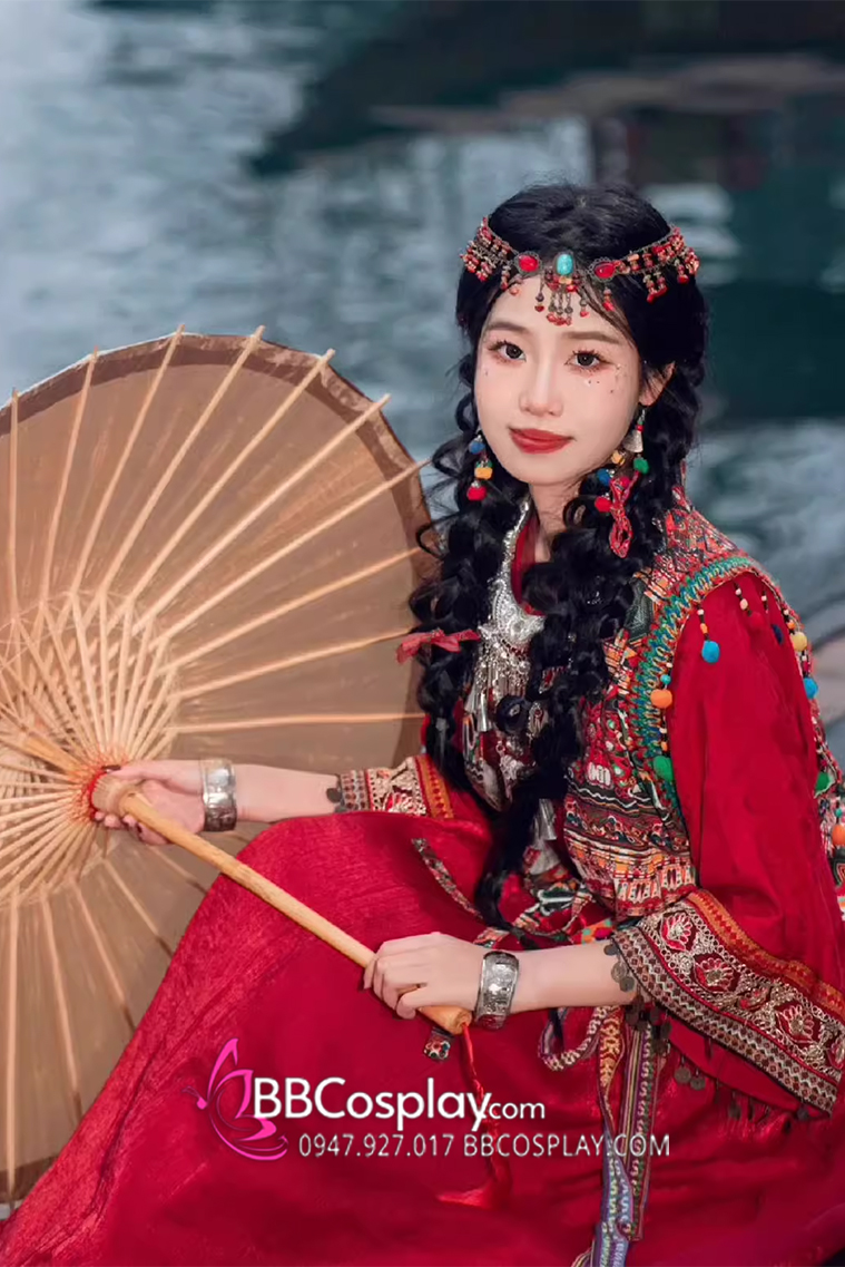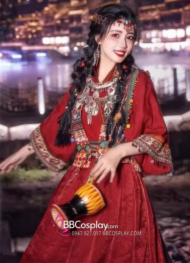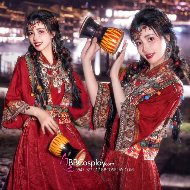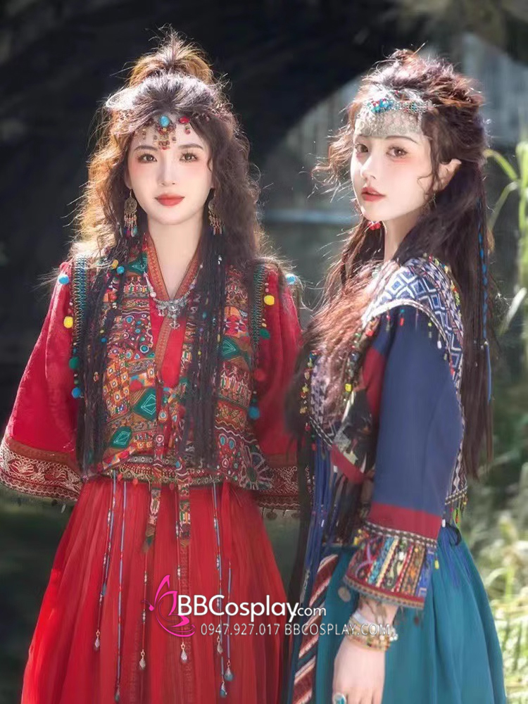 Thành phần: váy + áo trong vạt đắp chéo + khoác + lắc tay + cặp hoa tai + vòng trang sức đội đầu