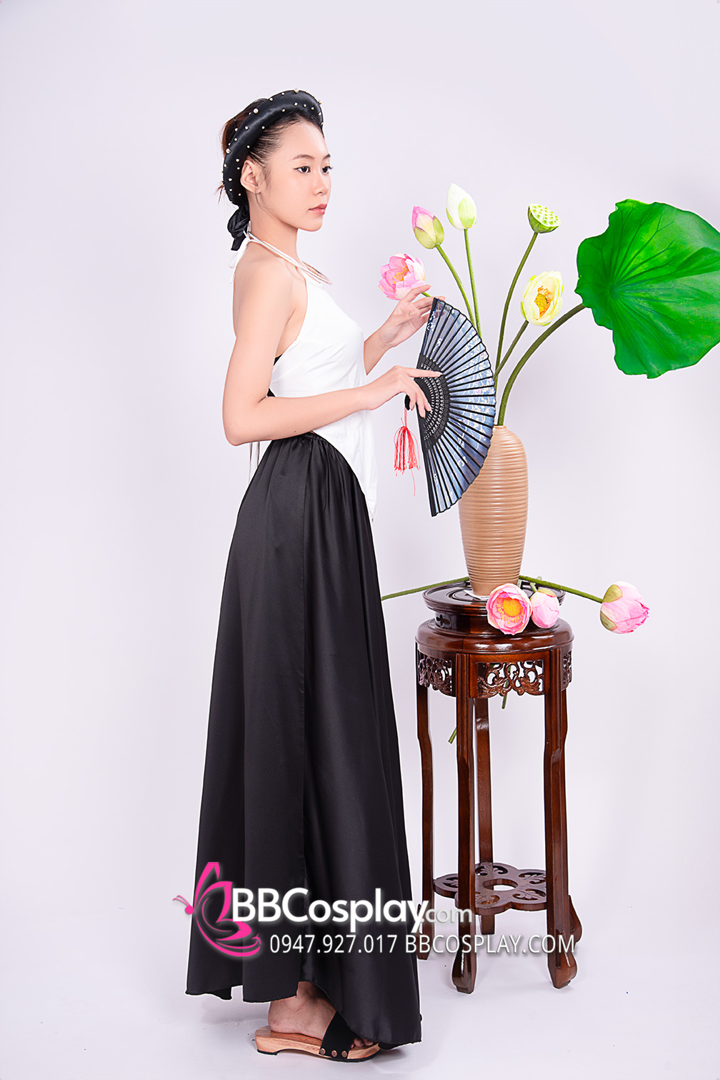 Phần váy chúng tôi cũng chỉ để màu đen cơ bản nhầm tạo sự nghiêm túc. Yếm trắng là sự chính chuyên - trong trắng. Mấn đen với một chút đá đính lên ý miêu tả người phụ nữ ấy vẫn chăm chút và sang trọng nhưng không loè loẹt. Trang phục này phù hợp hầu như mọi lứa tuổi, mọi vóc dáng người. Nếu bạn đang tìm 1 ý tưởng hoá thân thành nhân vật có chiều sâu thì đây là lựa chọn.