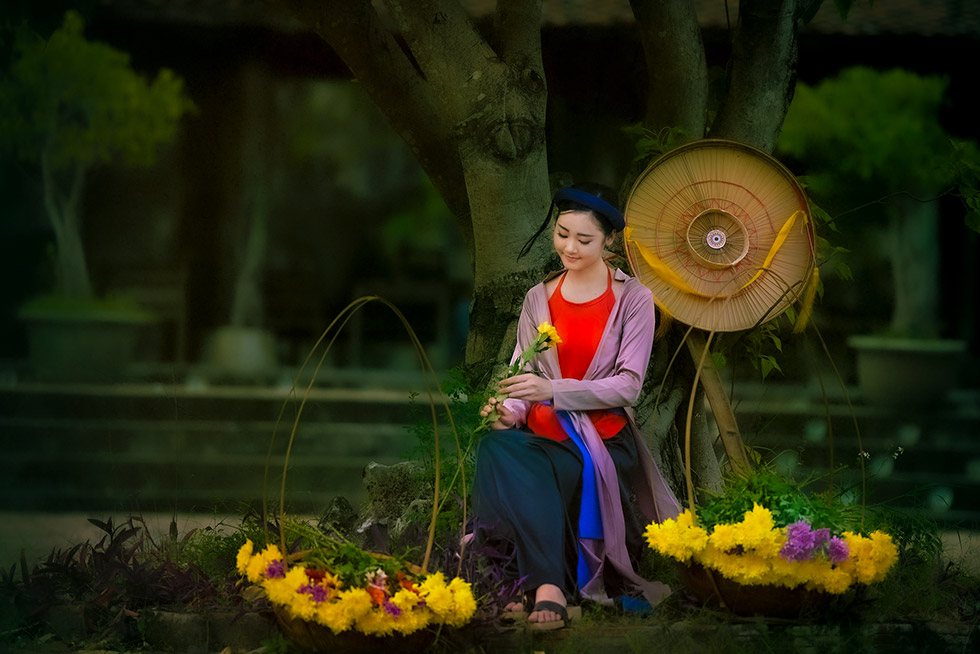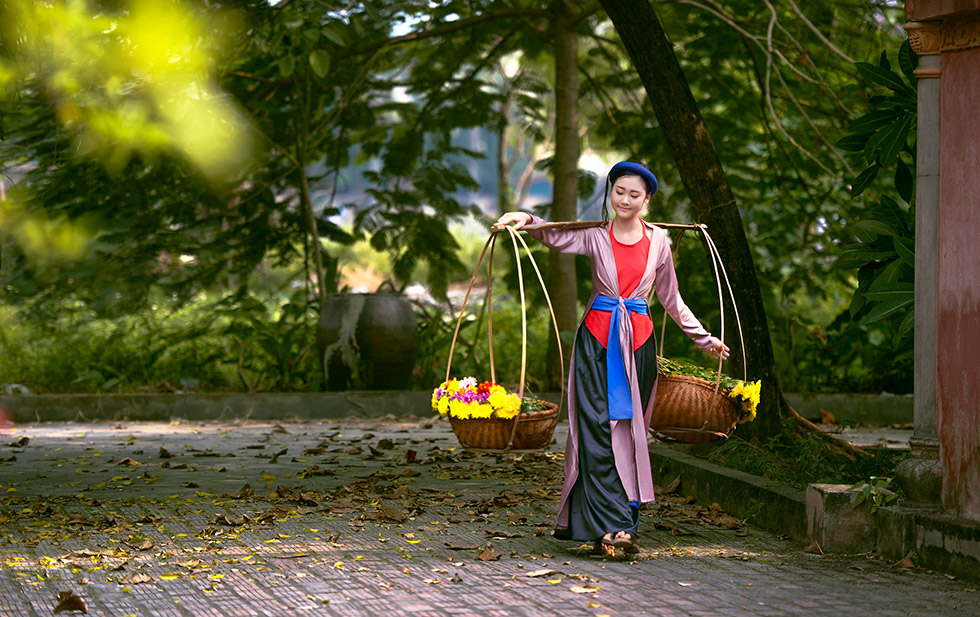 áo tứ thân + yếm+ váy ( đụp) + mấn ( khăn vòng) hoặc khăn mỏ quạ