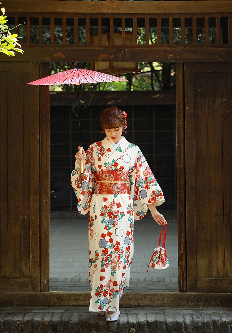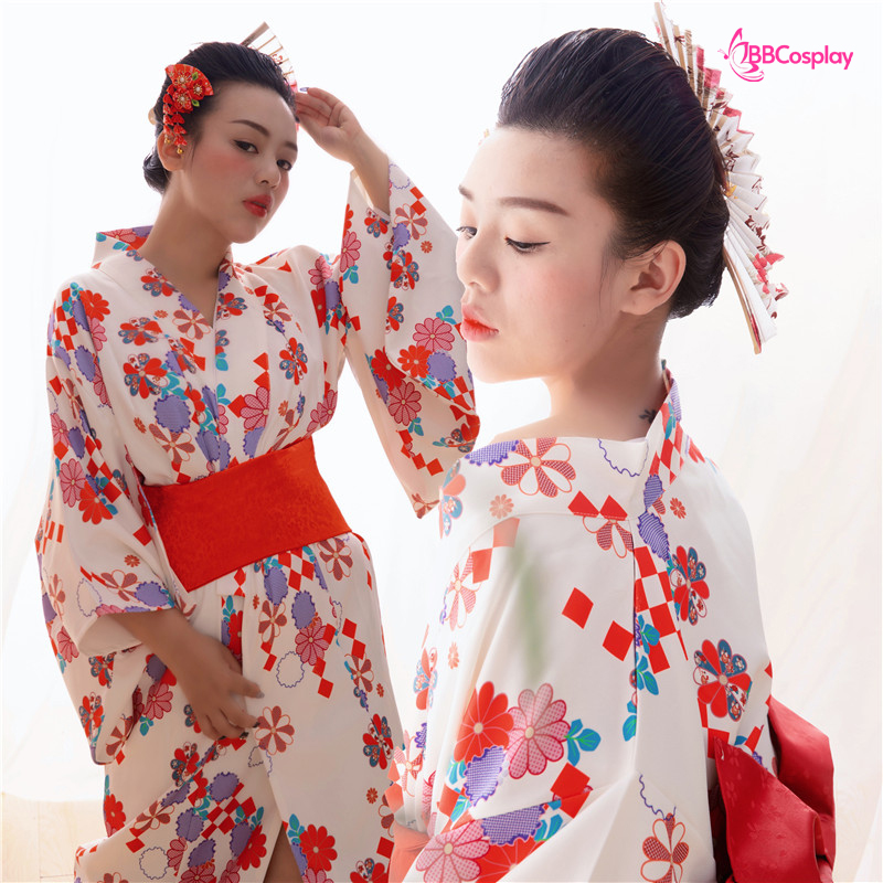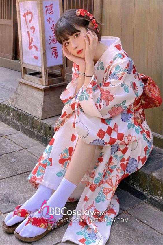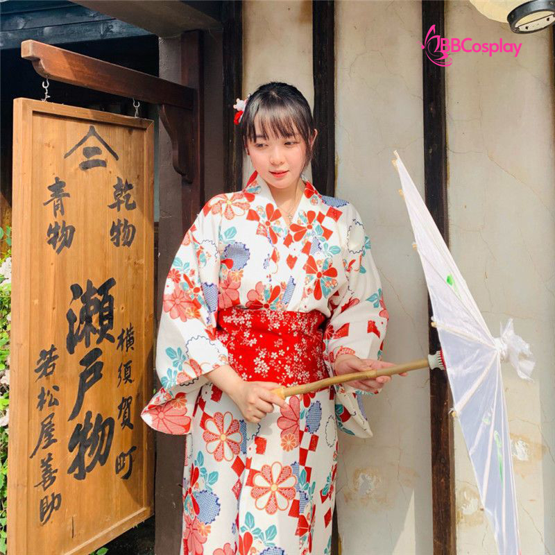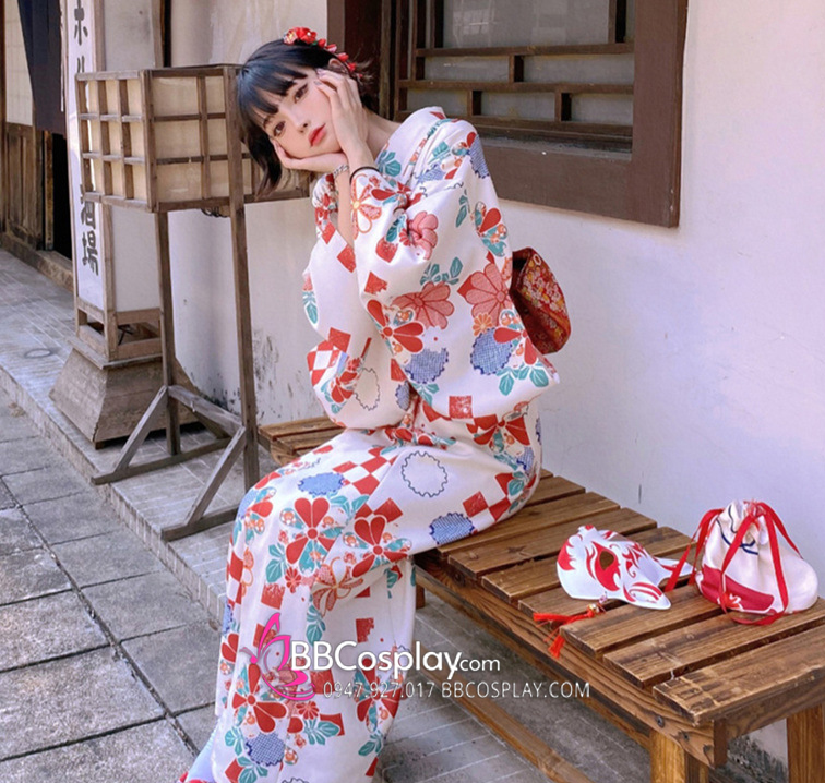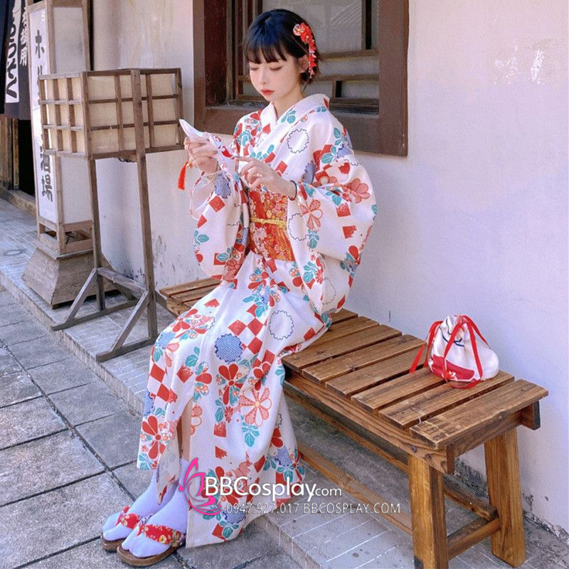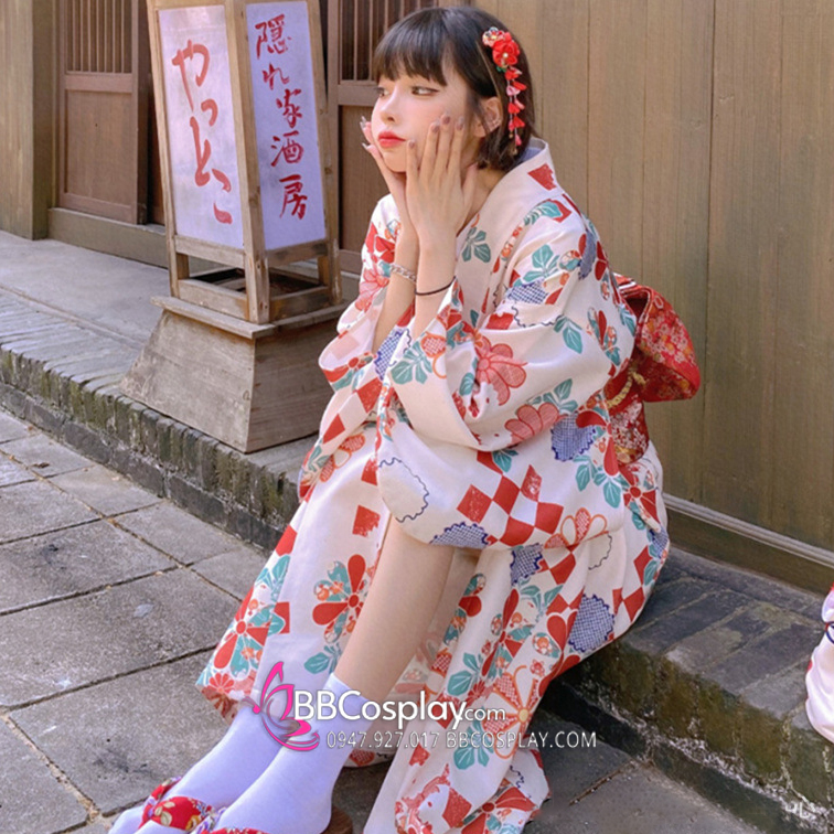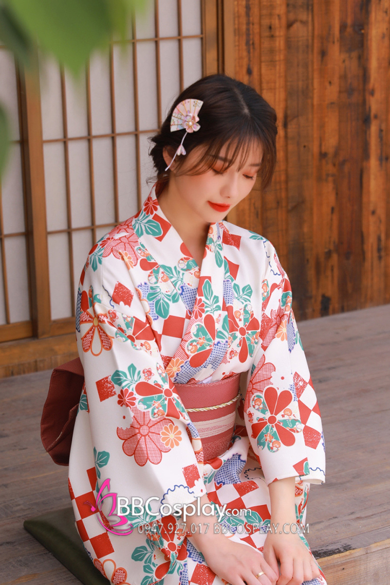 Áo Yukata Trắng Nền Hoa Caro Đỏ